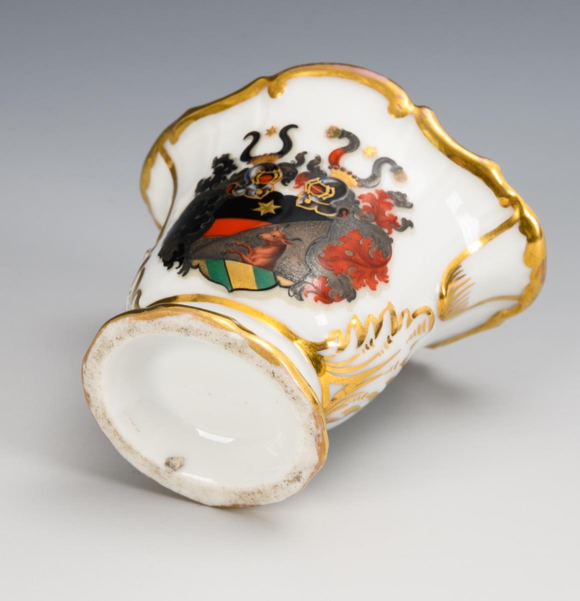 Passig-oval, footed body with gold-stamped rocaille relief and central bar. On the front a painted coat of arms with bull and double crest, on the reverse the dedication "E. Frhr. v. Klot-Trautvetter sm H. XV. Prinz Reuss 18 (...) 56". Minimal gold wear to the rim.