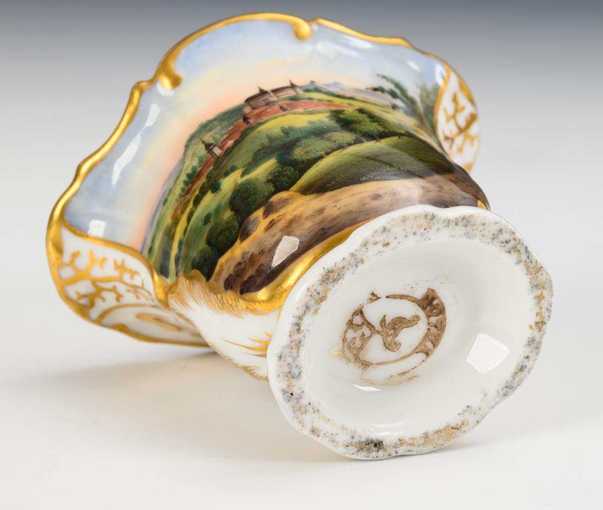 Passig-oval, footed body with gold-stamped rocaille relief and central bar. On the front the inscribed view of the city of Gotha with Friedenstein Castle.