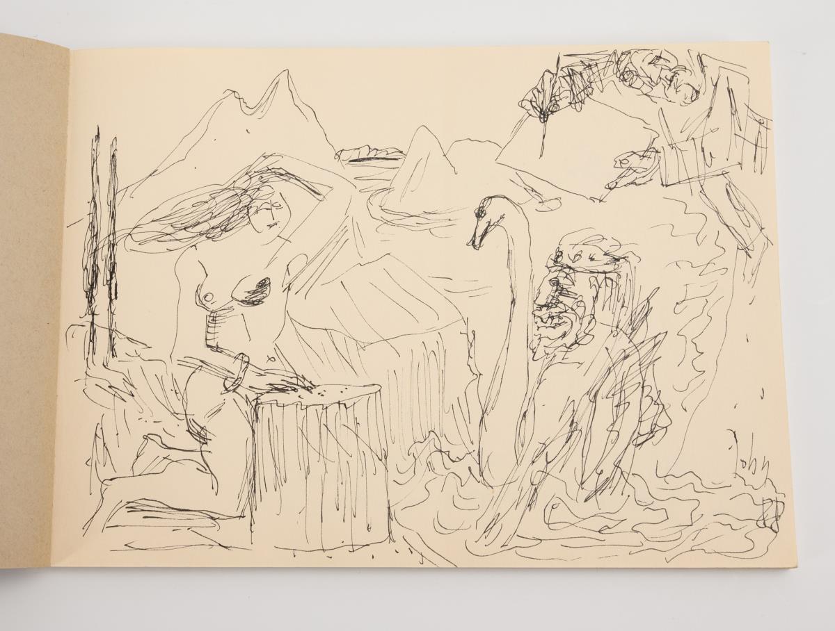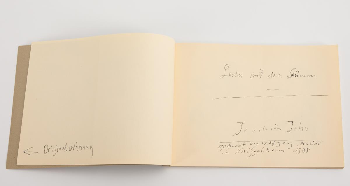 2 rare artist's books with original drawing on the cover: 1x with self(?)portrait (signed and dated: [19]87) and dedication "für Frau E. Lang in Neu-Frauenmark Oct. 1988", printed 1986, booklet: 22 x 21 cm | 1x with depiction of Leda with the swan and original drawing on dirt sheet (signed and dated: [19]88), printed 1988, booklet: 15 x 21 cm.