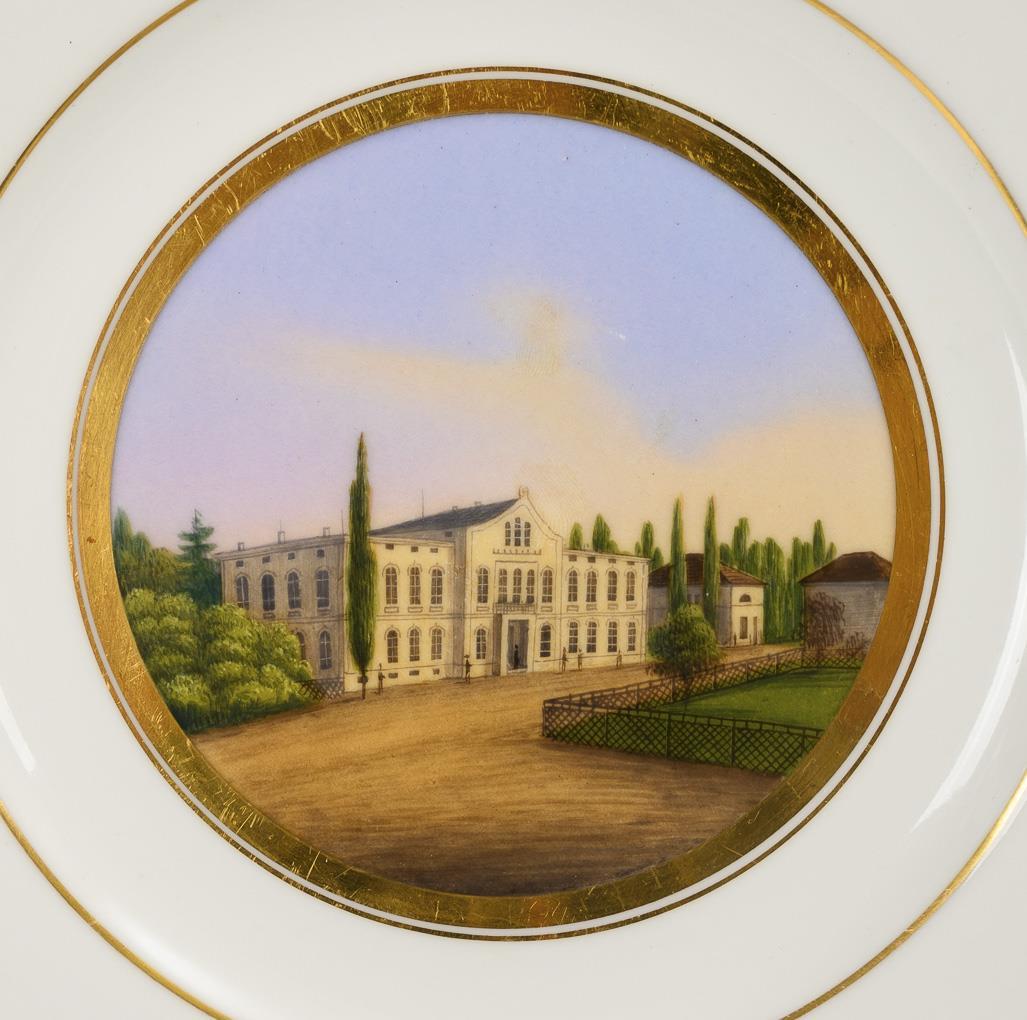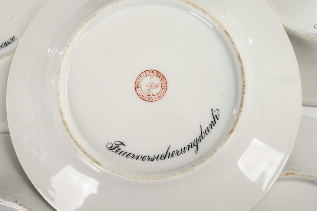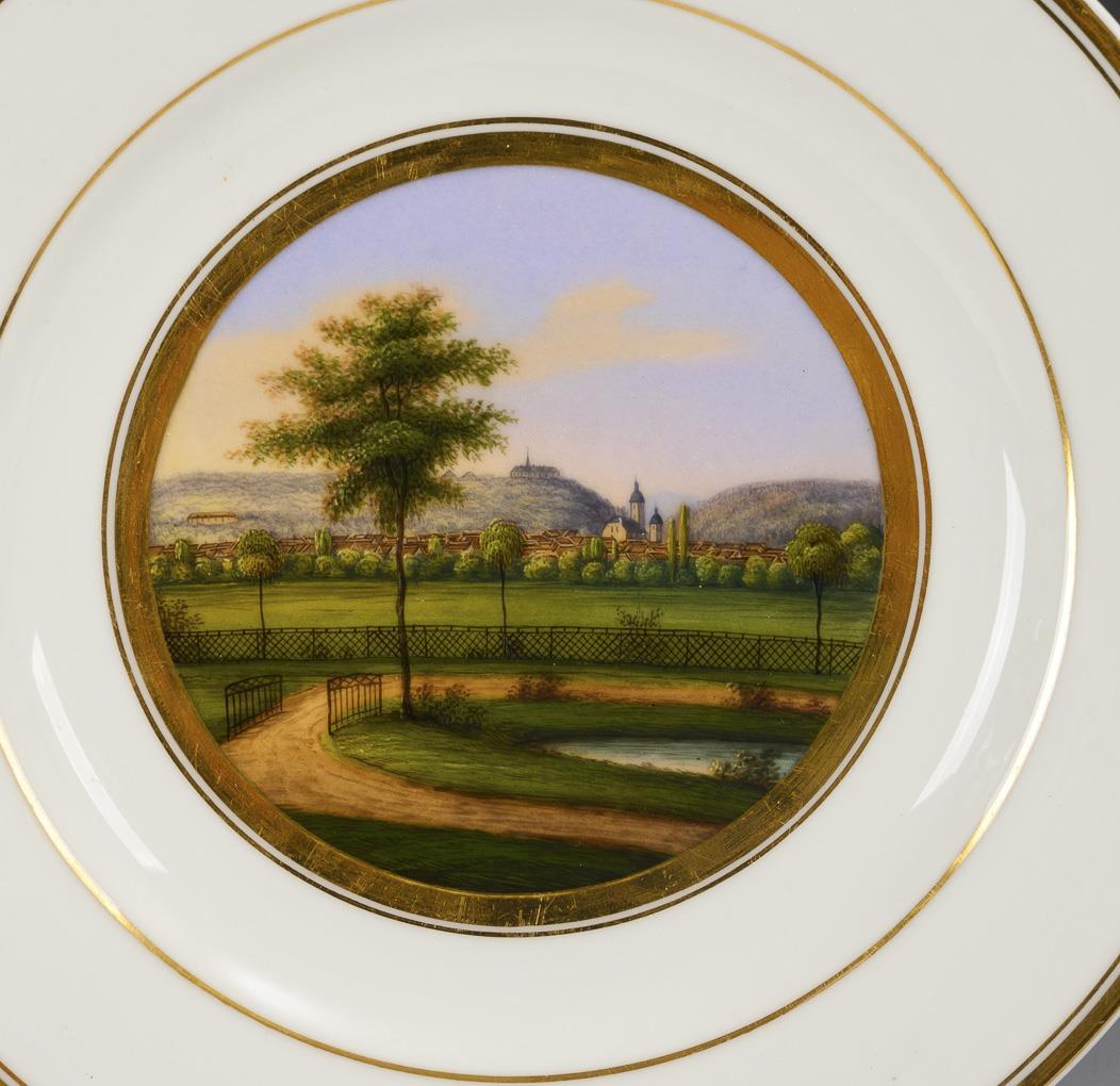 Plate with a painted view of Gotha in a mirror medallion inscribed on the underside (view from the castle terrace, Waltershausen, theater in Gotha, view from the park, fire insurance bank).