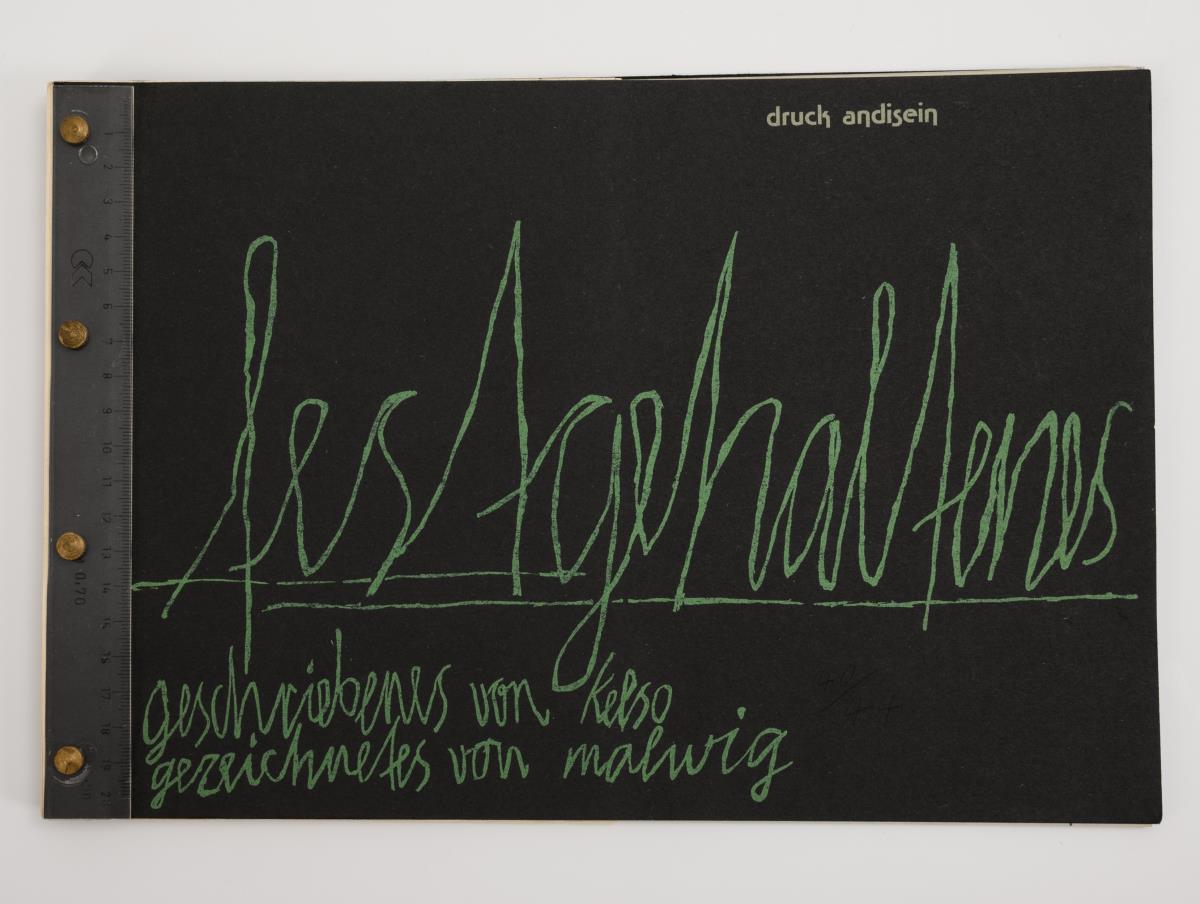 Rare artist's book with original screen prints on transparent paper and texts on laid paper, anthracite cover with screw binding on ruler.