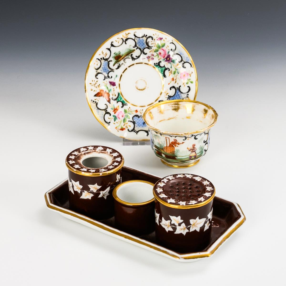 1x Gotha, Hennen mark, 1860 - ca. 1883: rectangular writing bowl with fixed inkwell, cylinder vessel and cylinder with shaker insert; brown base with white recessed ivy tendrils decorated in gold. / 1x unmarked: footed polygonal bell-shaped cup with chinoiserie scenes and rocaille, flower and bird painting. Writing utensil: rubbed, lid of the inkwell missing; cup and saucer: gold rubbed.