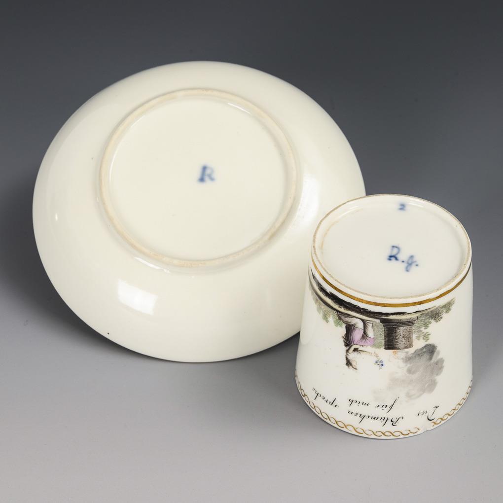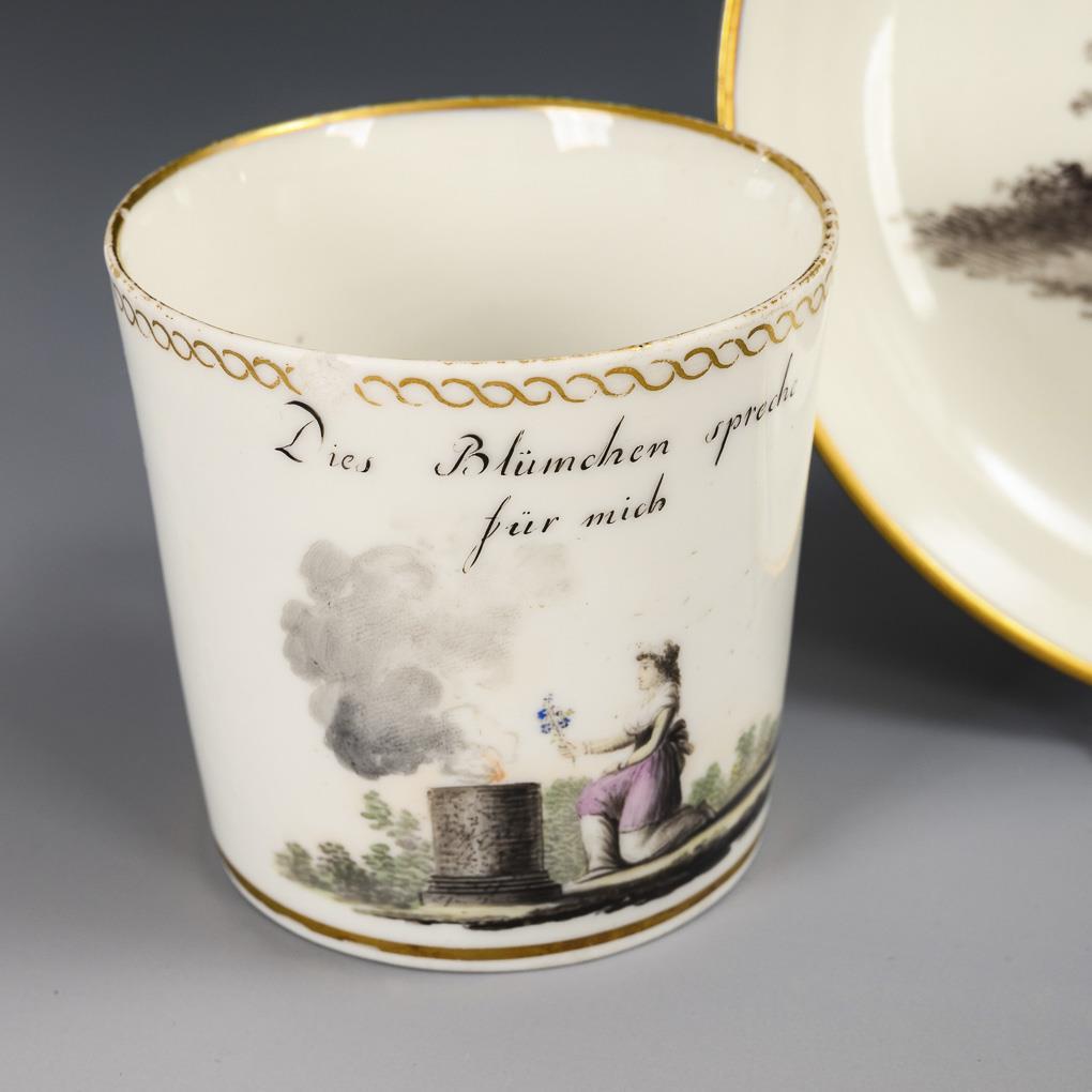 Conical cup with angled handle. The front depicts a young woman kneeling in front of a fire altar with a bouquet of forget-me-nots in her hand, above the saying "Das Blümchen spreche für mich". 1 chip to the rim and stand, gold somewhat rubbed.