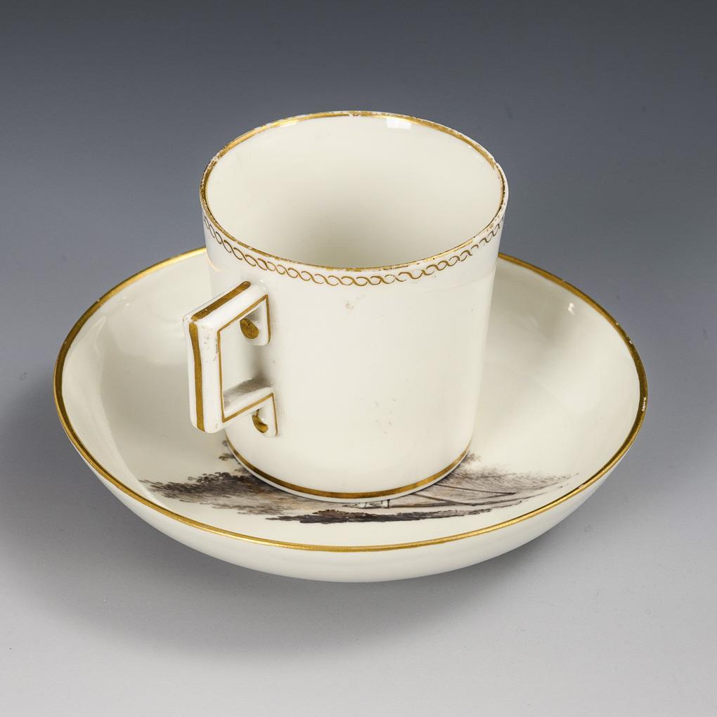 Polychrome painted, decorated in gold. Cup (h 6 cm), completed Gotha saucer with depiction of a child (Ø 12 cm).
