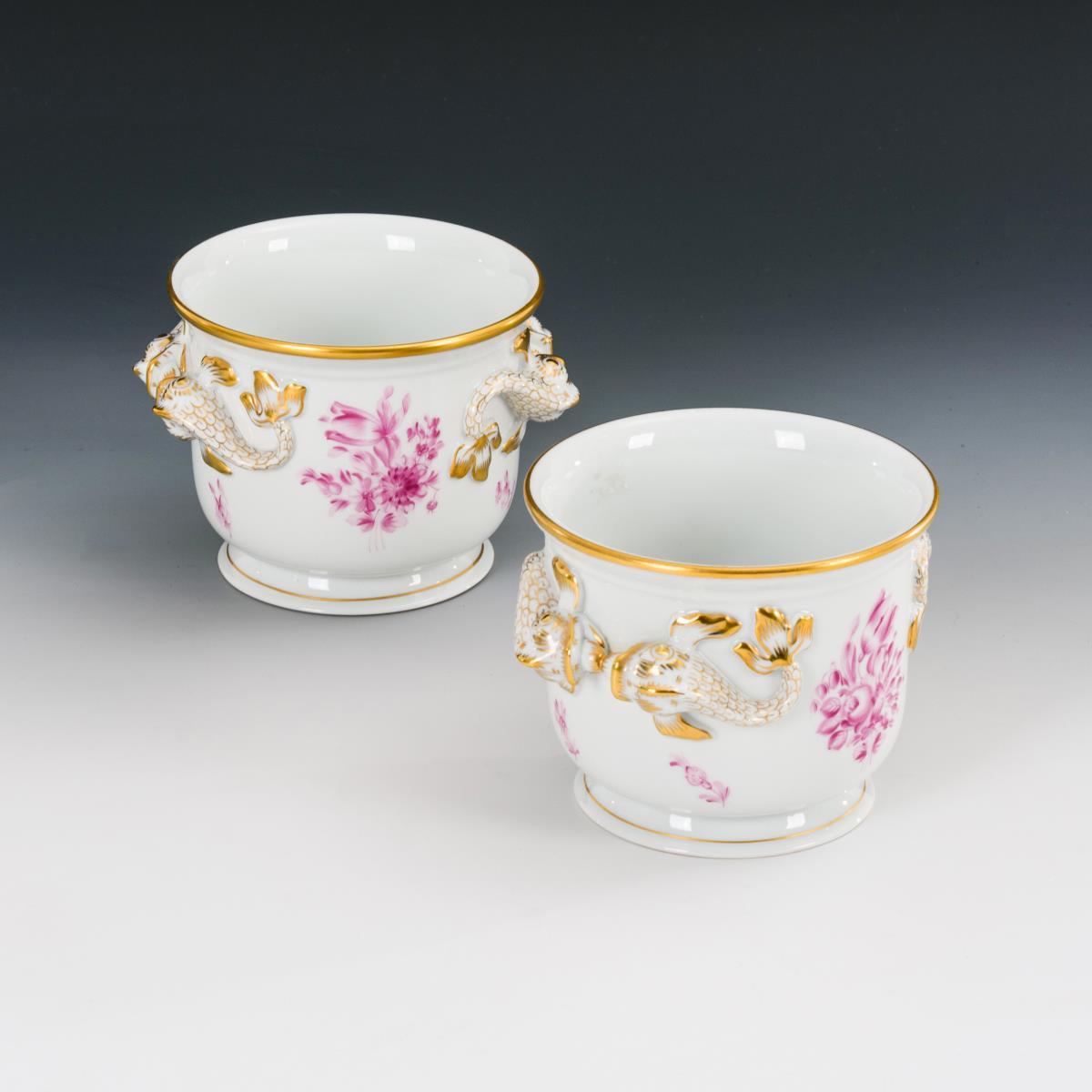 Zylindrische Gefäße mit konischem Stand und je zwei Delfinhandhaben.