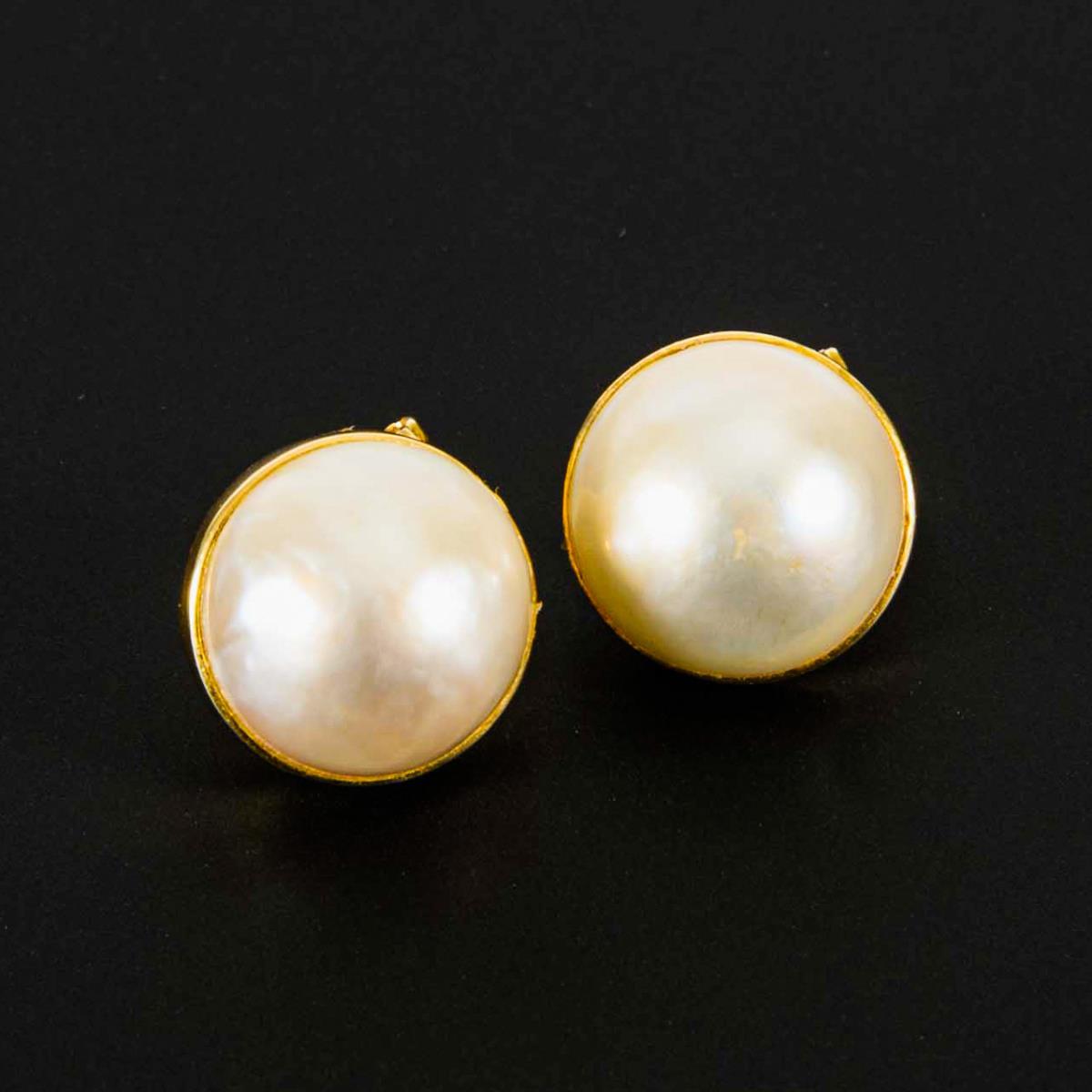 Stamped 585 yellow gold. Pearl Ø 1.3 cm. Stud earrings Ø 1.5 cm. 6,5 g.