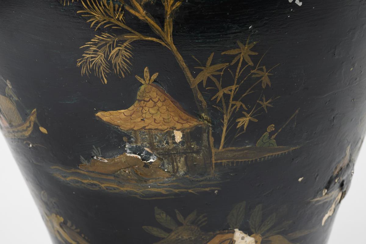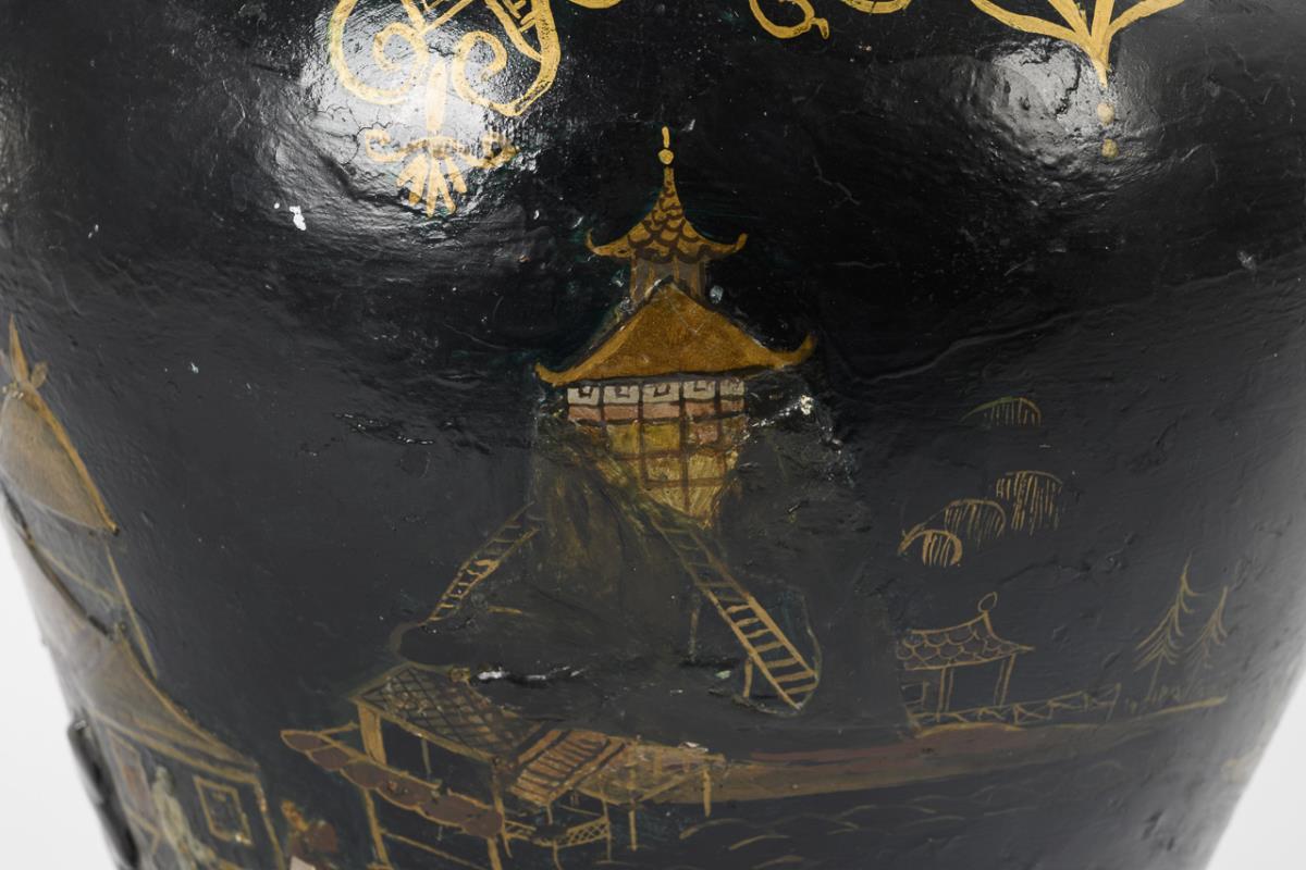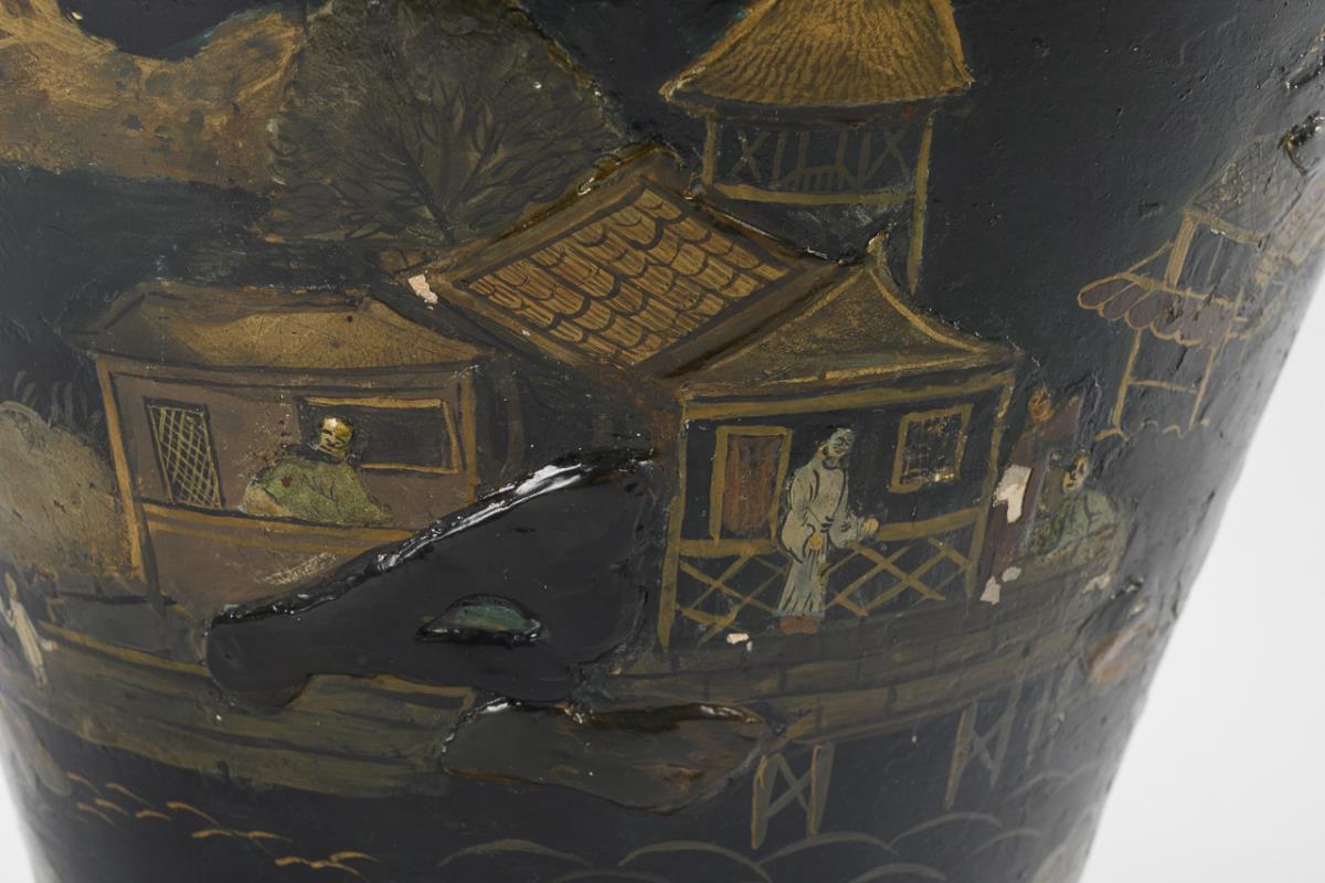 Sand-colored body, stuccoed and covered with black-blue and black-green, partly lustrous lacquer, painted in white, green, red, yellow, bronze and silver, partly with gold leaf decoration, white pewter glaze inside and on the stand. H approx. 65 cm.