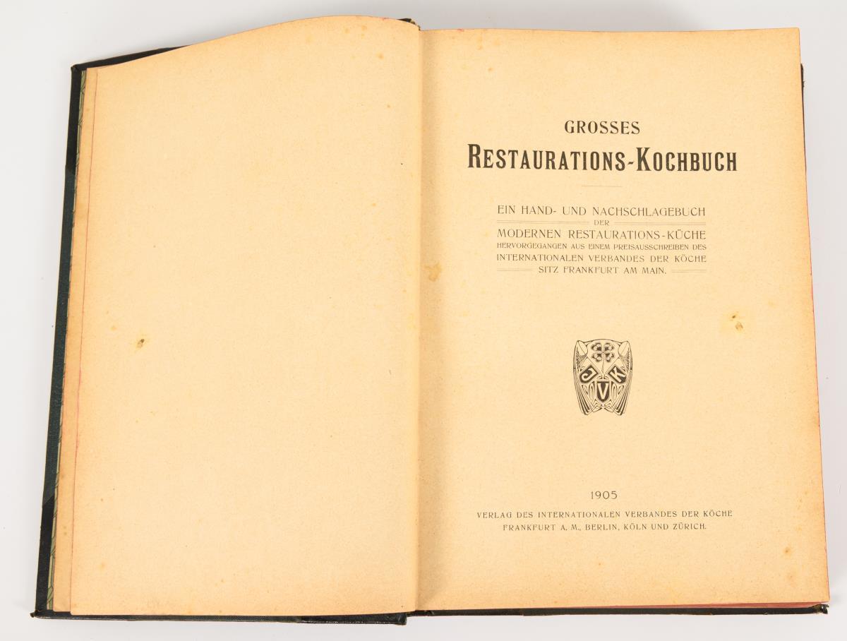 "Grosses Restaurations-Kochbuch, ein Hand- und Nachschlagebuch der modernen Restaurations-Küche", Berlin, Cologne, Zurich 1905. Recipes and sequences of dishes. Half leather binding / Scheibler, Sophie Wilhelmine: "Allgemeines deutsches Kochbuch für bürgerliche Haushaltungen ...", Berlin 1832, 8th improved edition, 404 pages, paperback.