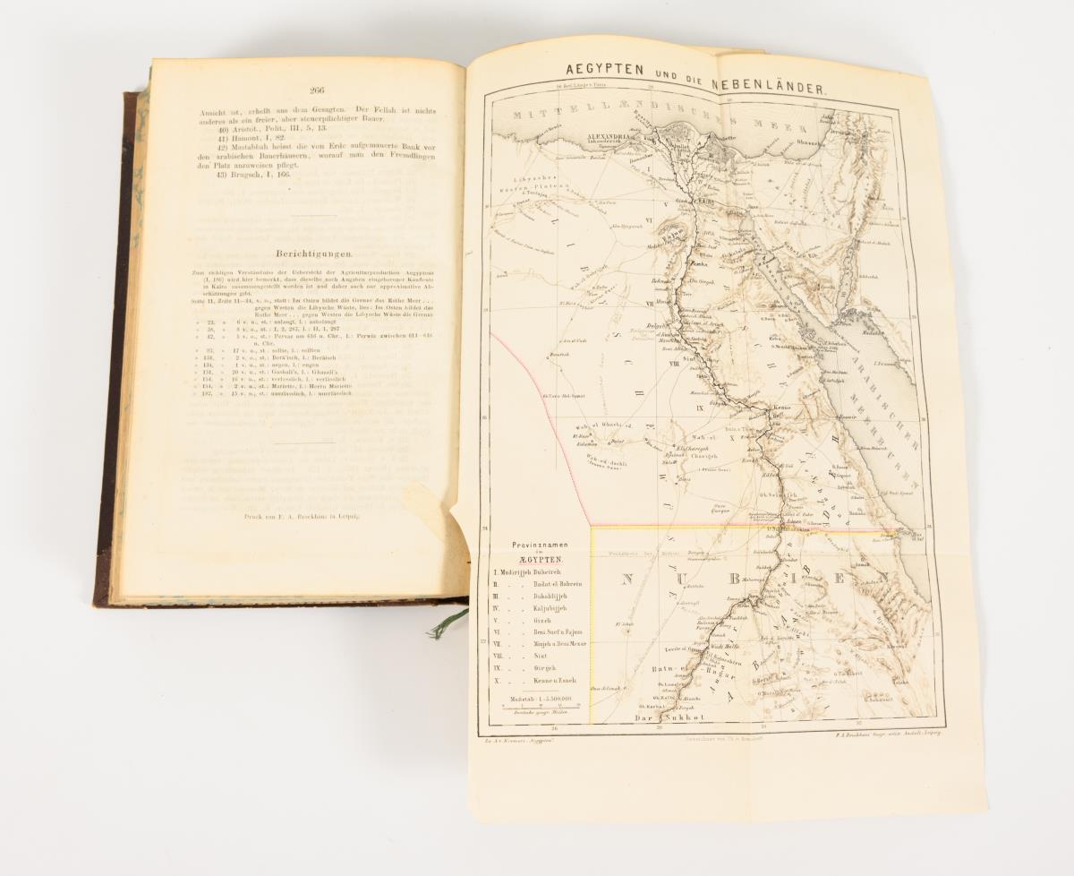 2 volumes in one book. Physical geography, ethnography, agriculture. 266, 336 pages with a map. Half cloth binding.