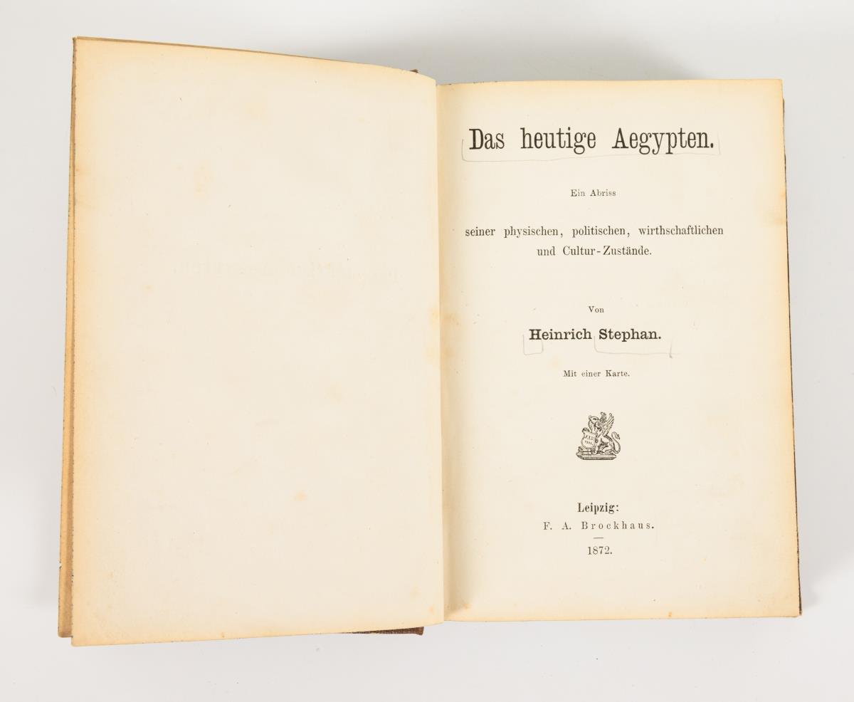 Lepsius, Richard: "Letters from Egypt, Ethiopia, and the peninsula of Sinai. With Extracts from his Chronology of the Egyptians, with Reference to the Exodus of the Israelites". Published by Henry G. Bohn, London 1853. 578 pages, 2 maps and a lithograph. Spine somewhat damaged / Heinrich Stephan: "Das heutige Aegypten, ein Abriss seiner physischen, politischen, wirtschaftlichen und Cultur-Zustände". Leipzig 1872. 528 pages and a map.