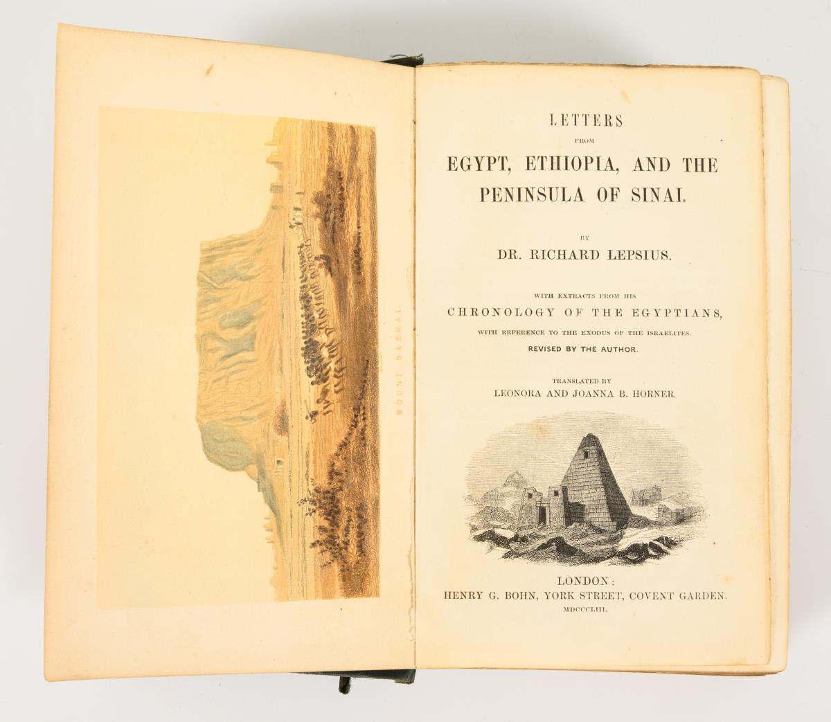 Lepsius, Richard: "Letters from Egypt, Ethiopia, and the peninsula of Sinai. With Extracts from his Chronology of the Egyptians, with Reference to the Exodus of the Israelites". Published by Henry G. Bohn, London 1853. 578 pages, 2 maps and a lithograph. Spine somewhat damaged / Heinrich Stephan: "Das heutige Aegypten, ein Abriss seiner physischen, politischen, wirtschaftlichen und Cultur-Zustände". Leipzig 1872. 528 pages and a map.