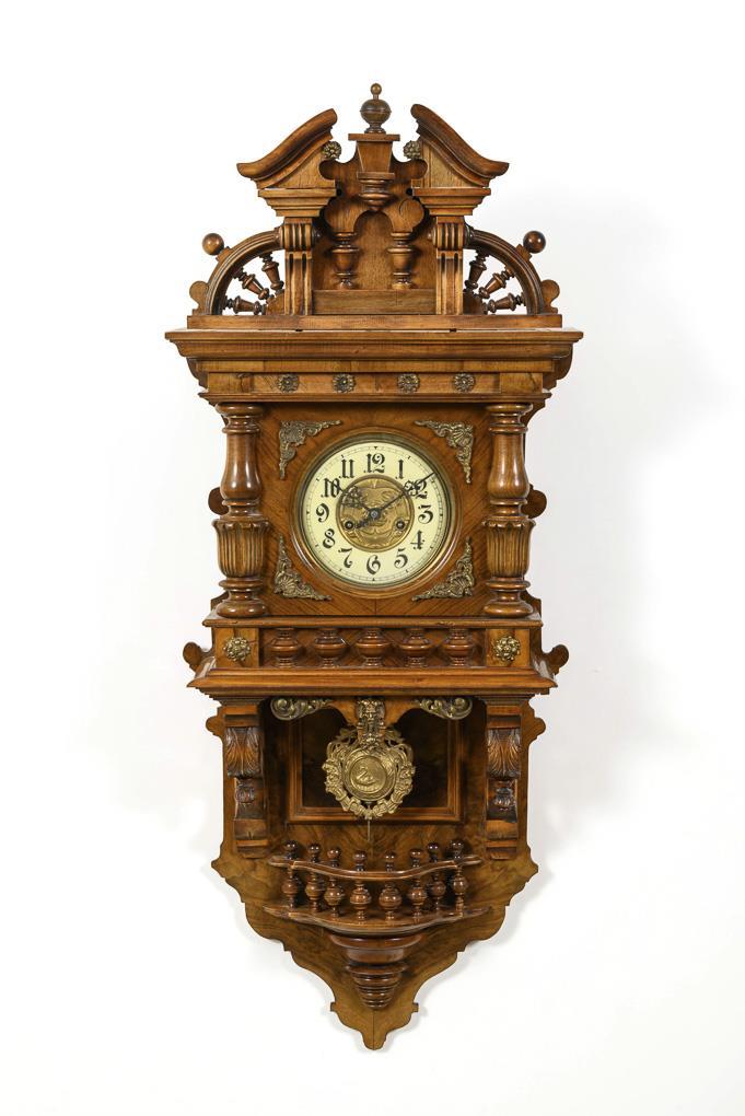 Elaborately designed historicism wall clock with rich turnery and pillar decoration, crowning with blown pompous pediment, bronze applications. Signs of age and wear, tenon crown missing.