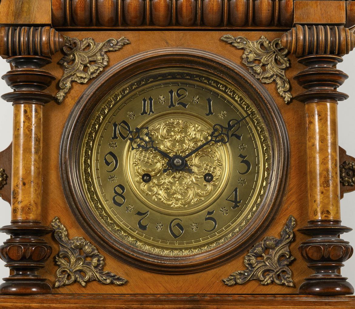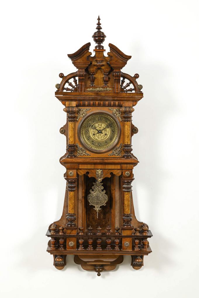 Elaborately designed, 3-sided glazed historicism wall clock with architectural structure, crowning, angular pendulum balcony with coffered pendulum board and balustrade, bronze applications with mascaron, putti and rosettes, turnery and column decoration. Slight signs of age and wear.