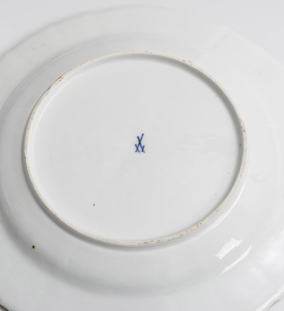 Dining plate with old Brandenburg stone relief decoration. In the mirror a bouquet of flowers with rose, tulip and pansy, on the rim four oval cartouches with bird painting.