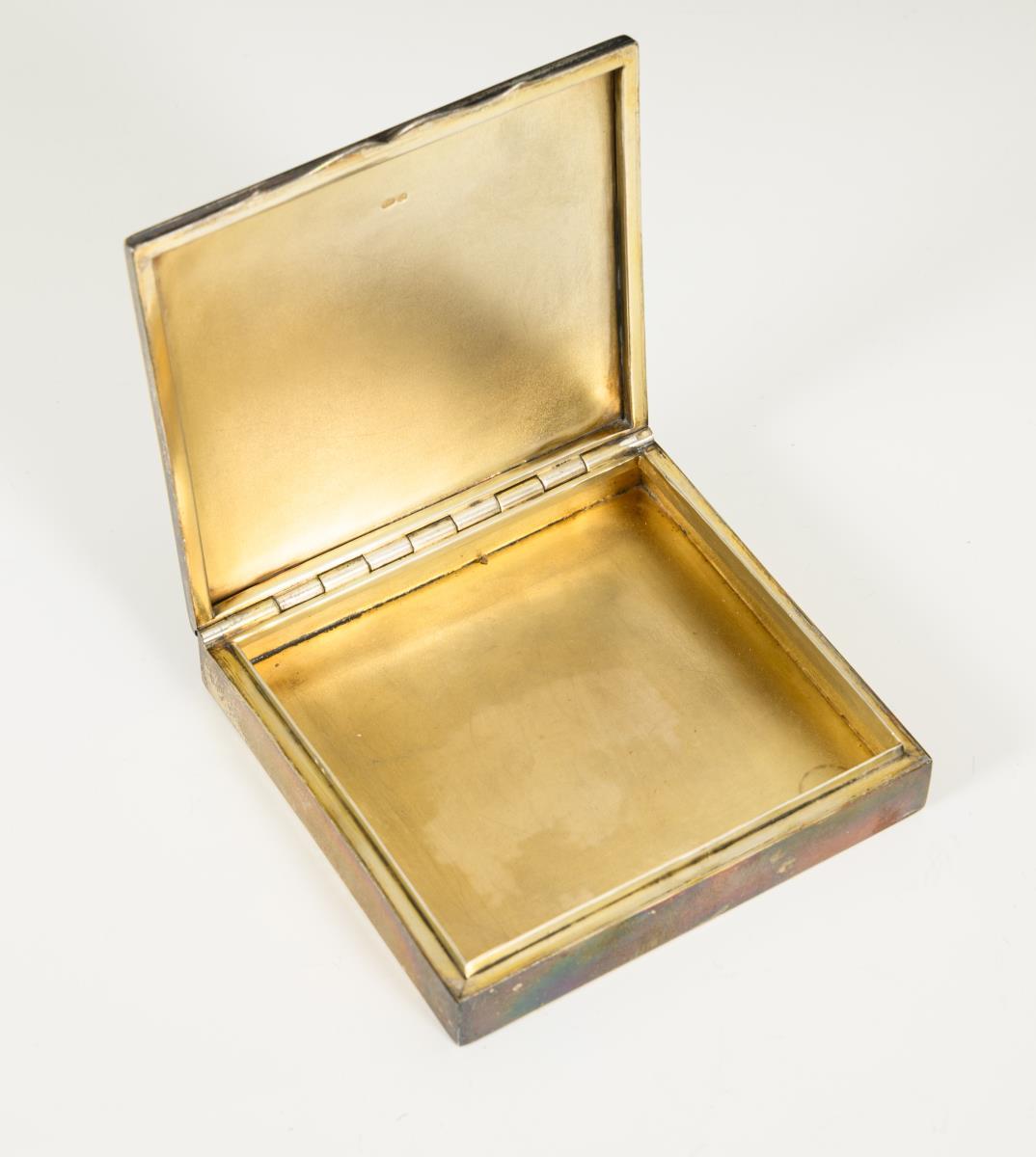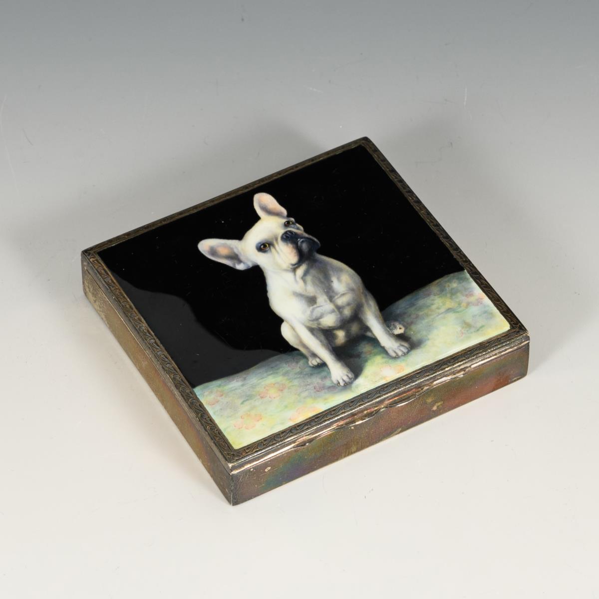 Silver cigarette case with enameled dog picture.