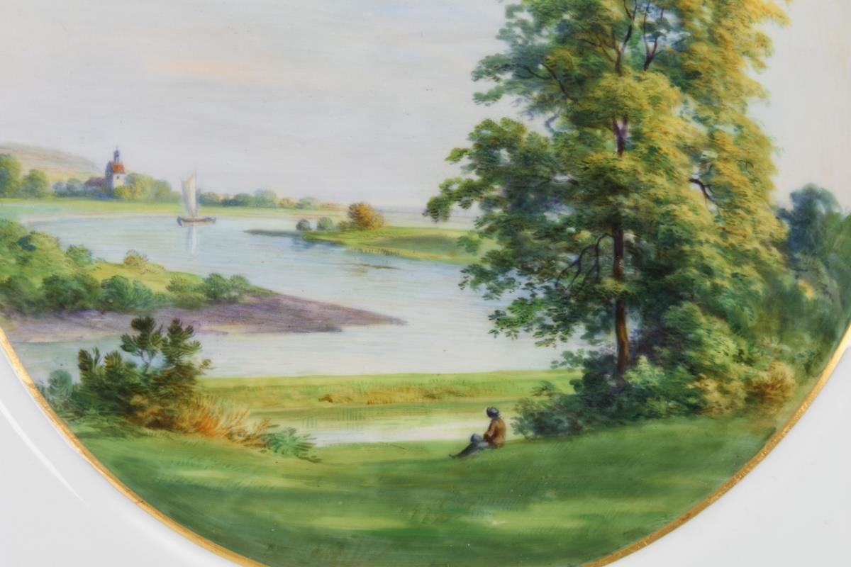 Smooth plate depicting a river landscape with sailing boat and figural staffage.
