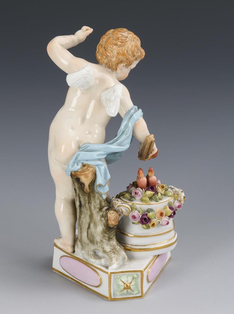 A Cupid boy with a torch standing by a ram's head bowl with roses and flaming hearts, the inscription "Je les enflammé.". 1 finger and a few flowers and leaves chipped.