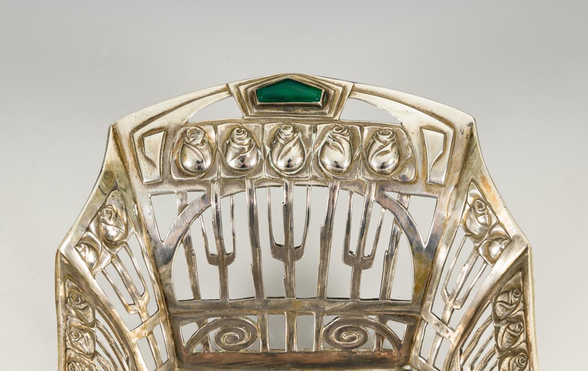 Rectangular openwork bowl with rose blossoms in relief and 2 green agates.