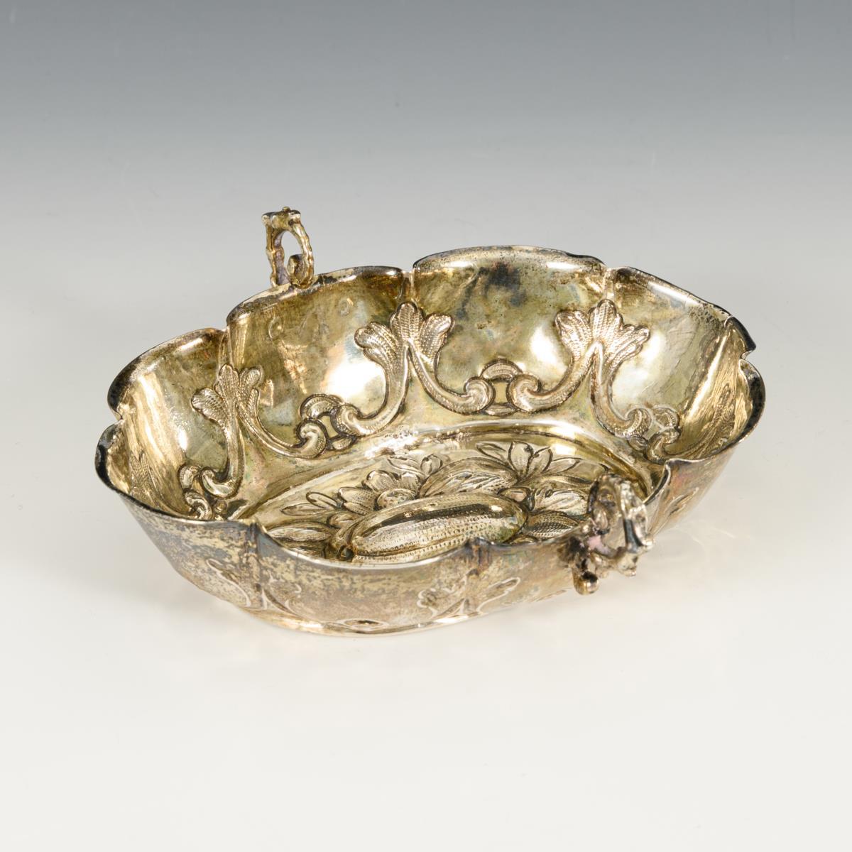 Oval bowl with humped rim and fruit motifs in relief in the mirror. Both handles soldered, several small cracks to the rim.