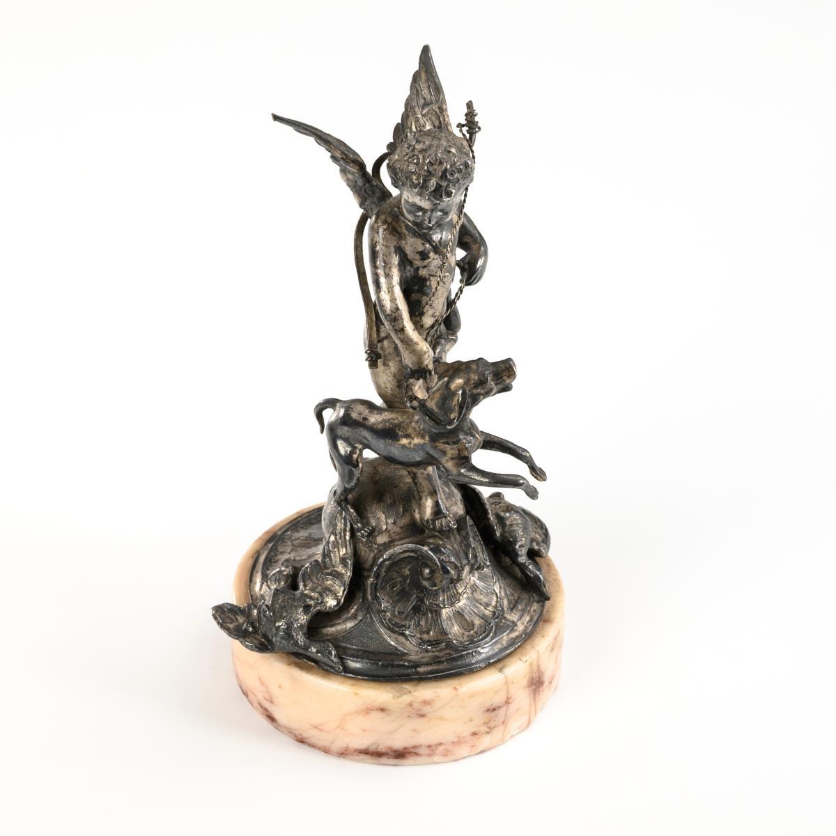 Silver-plated cupid with hunting dog