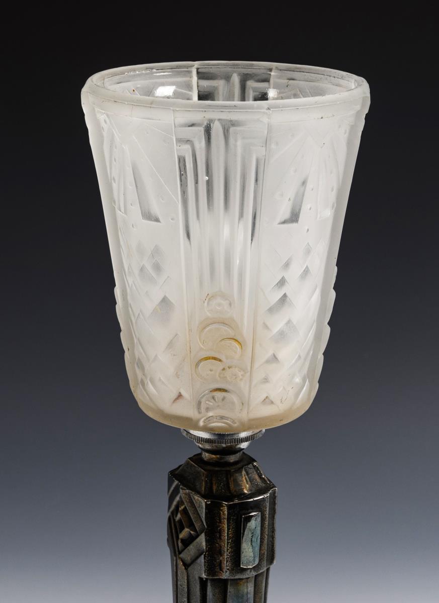 Geometrically reliefed lamp with hexagonal base and conically rising shaft as well as conical shade with adequate relief. Blackened, minimal chips and minimal stress crack on the glass, at least plug renewed. Works fine.