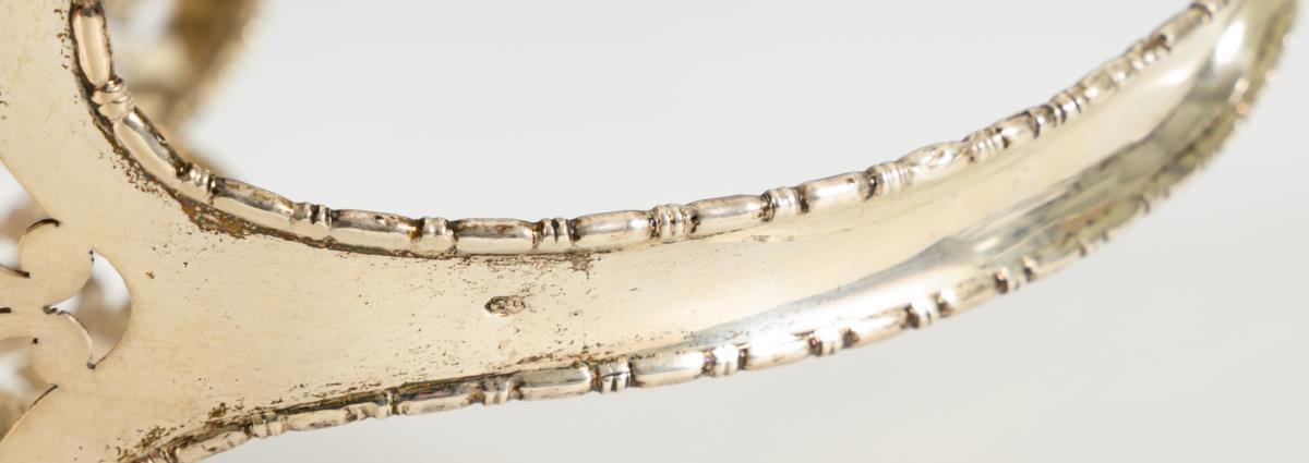Rectangular pierced bowl with bow handle. Few, minimal dents.