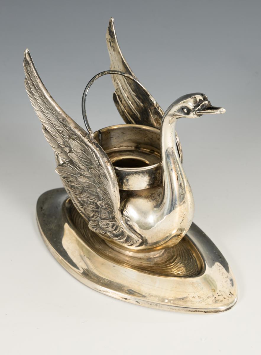Silver swan jar and 5 egg cups.