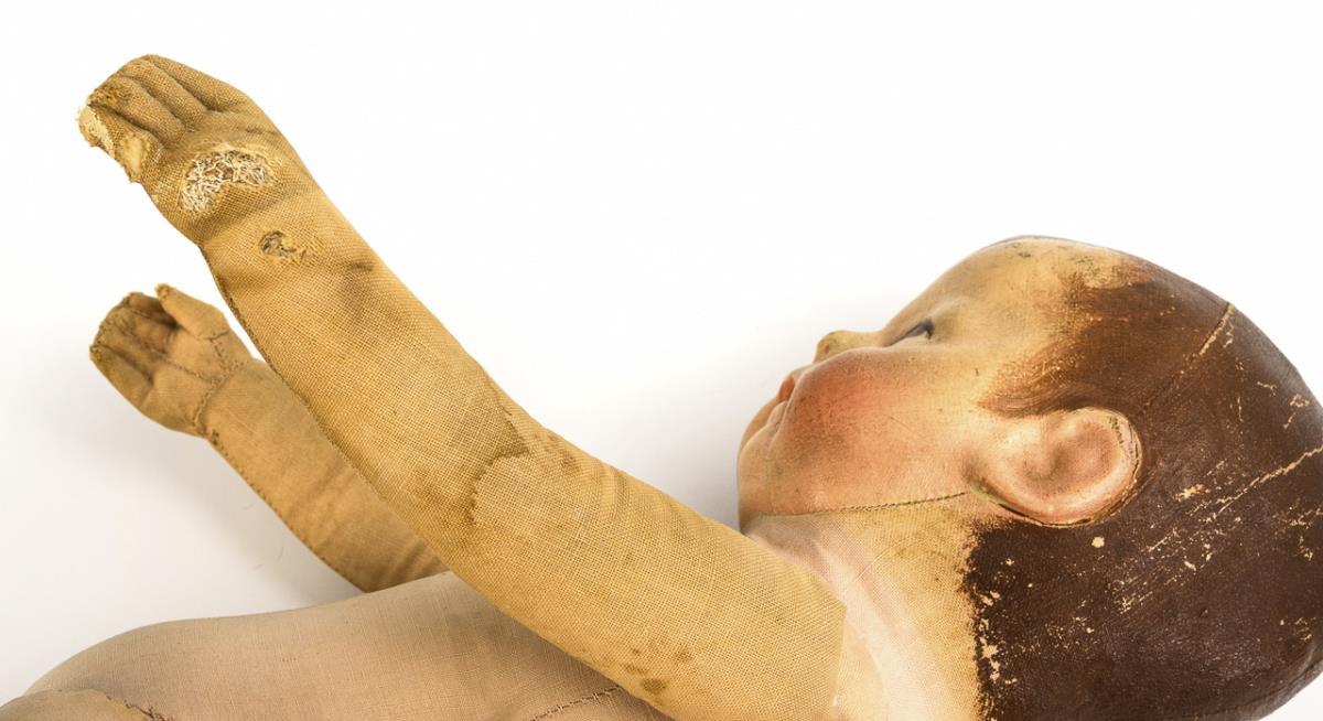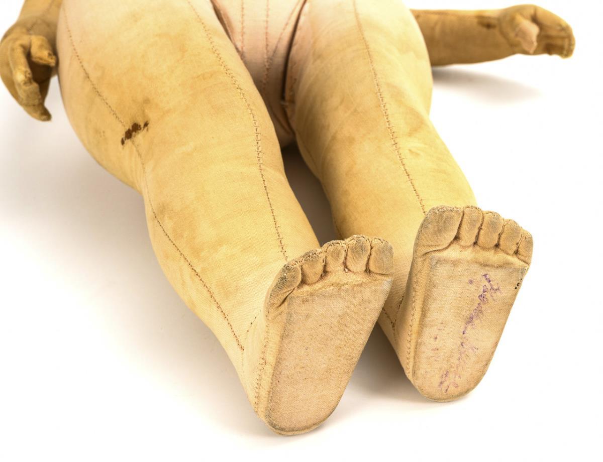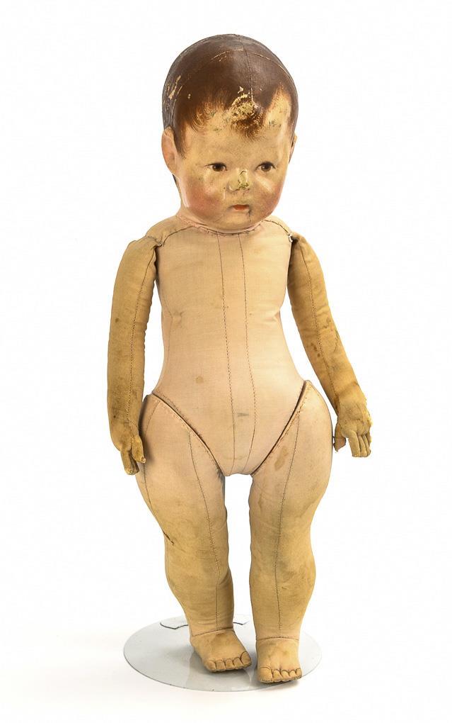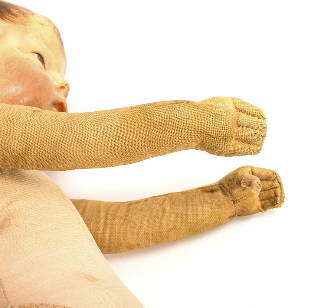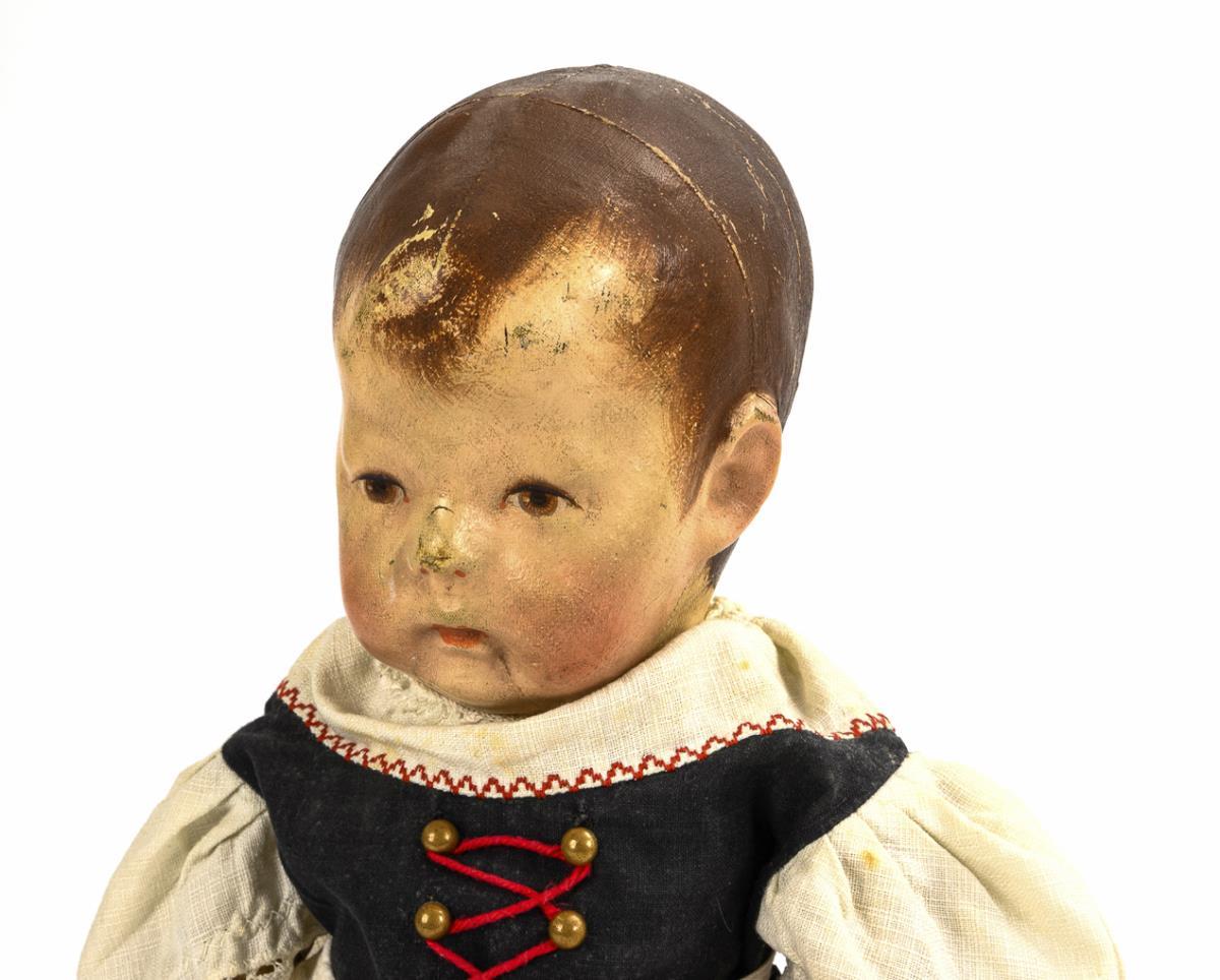 Mask-like painted fabric head with 3 occipital and 2 chin nostrils. Fabric body with wide hips. Old black and red dirndl with white apron, young black oilcloth shoes. Head and tip of the nose with paint defects, hands with defects and 1 plaster.