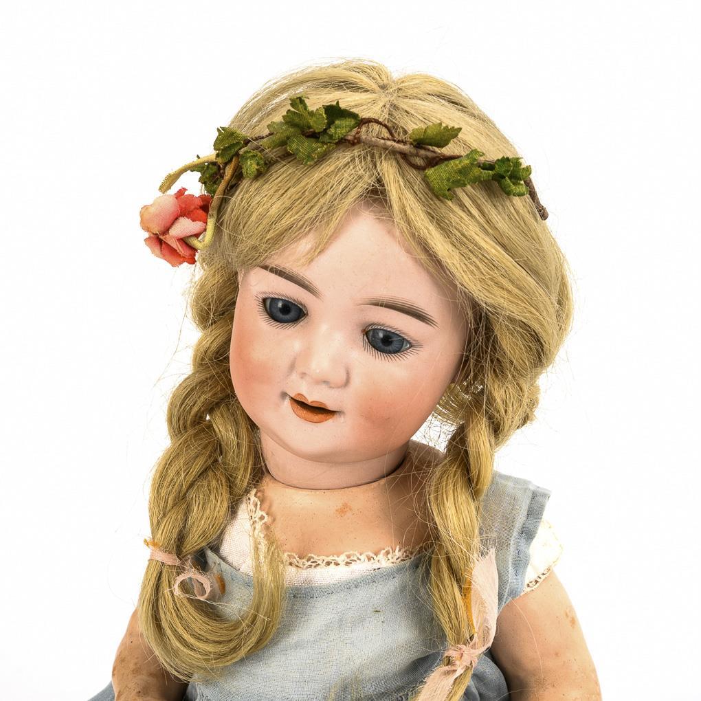 Cranked head, blue sleeping eyes, blonde real hair wig with plaits. 5-part sitting baby body with light blue dress. Head x-rayed: without cracks, only minimal wig pull. Left hand repaired.