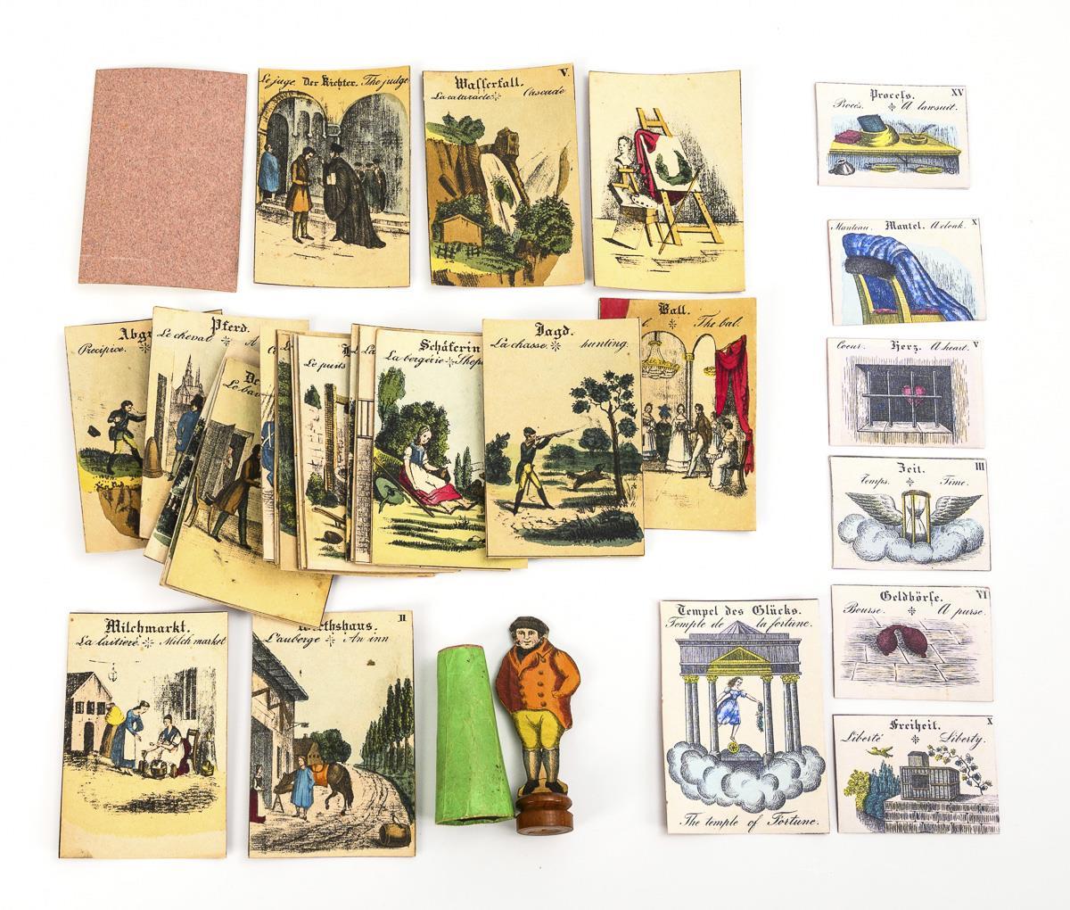 23 original cardboard cards, 7 supplemented cards, 1 playing piece and 1 dice. Description enclosed as a copy of the original. Signs of age, stamps missing.