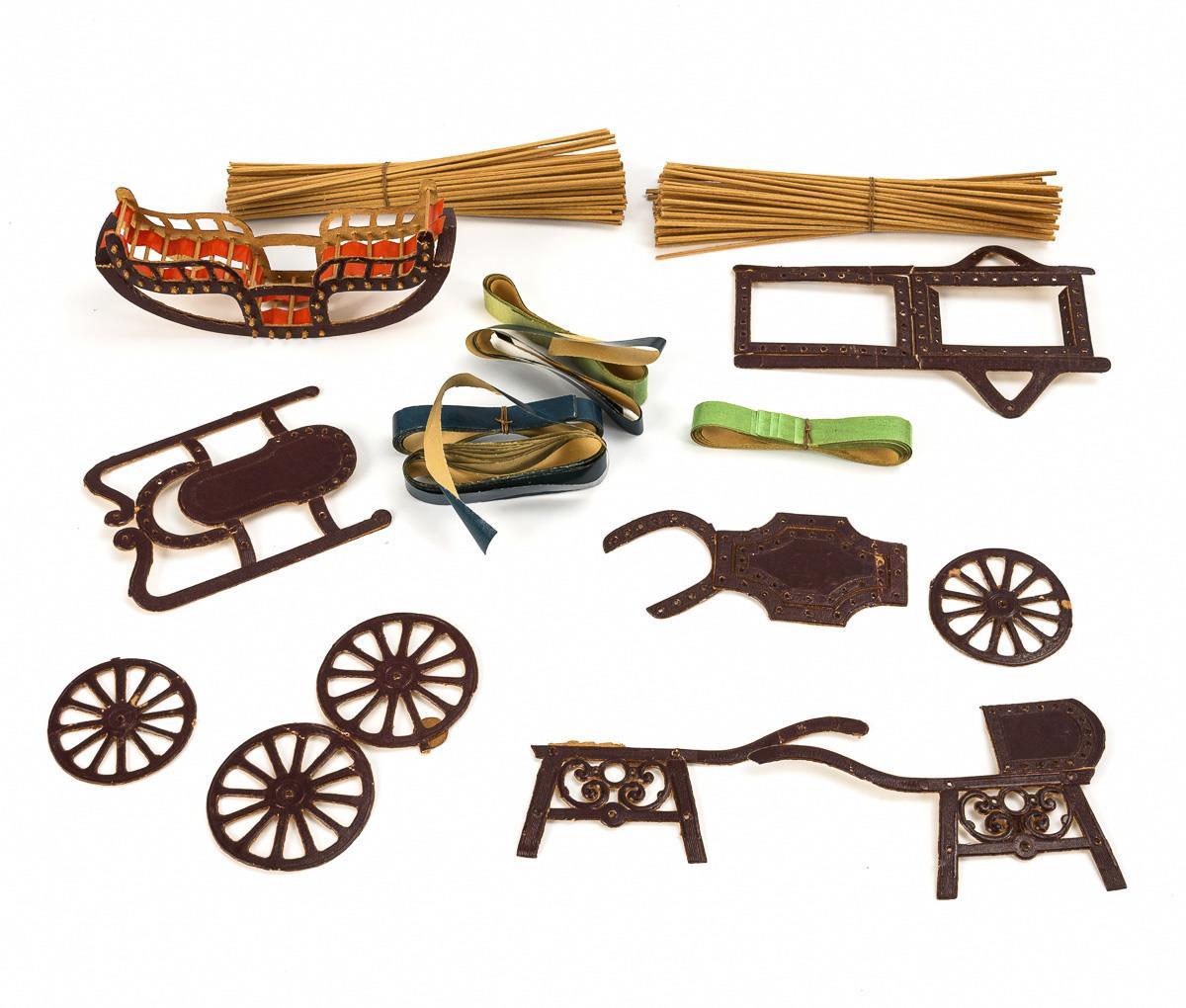 Small vehicles can be assembled from pre-cut cardboard, wooden sticks and ribbons. 1 seesaw already built. Labeled in English on the box. Carton with defects, completeness not checked.