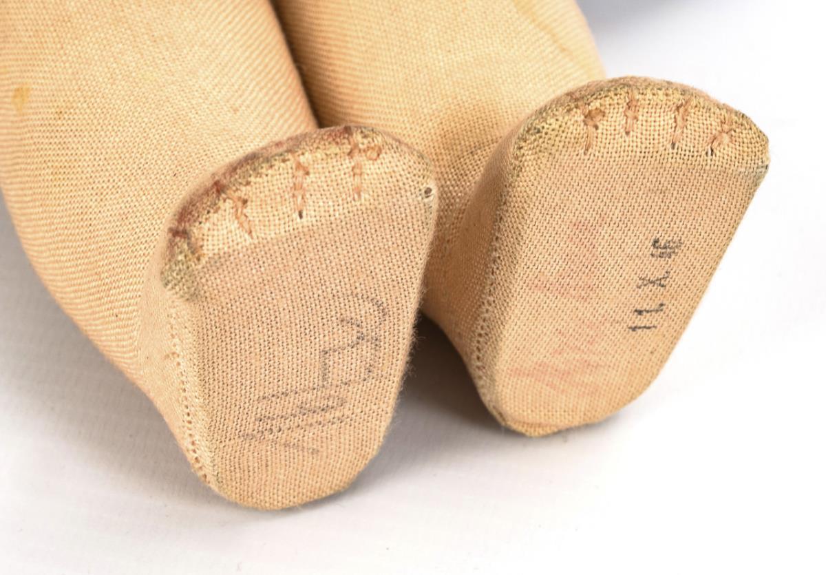 Mask-like painted fabric head with 3 seams at the back of the head, blue eyes and blond human hair wig. Cloth body with loosely sewn-on limbs and button at the back (ribbon missing).