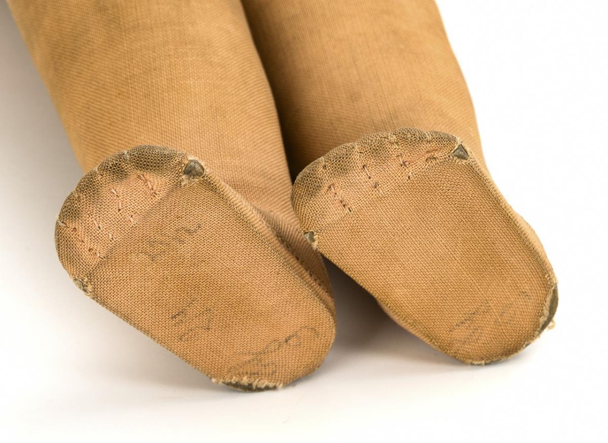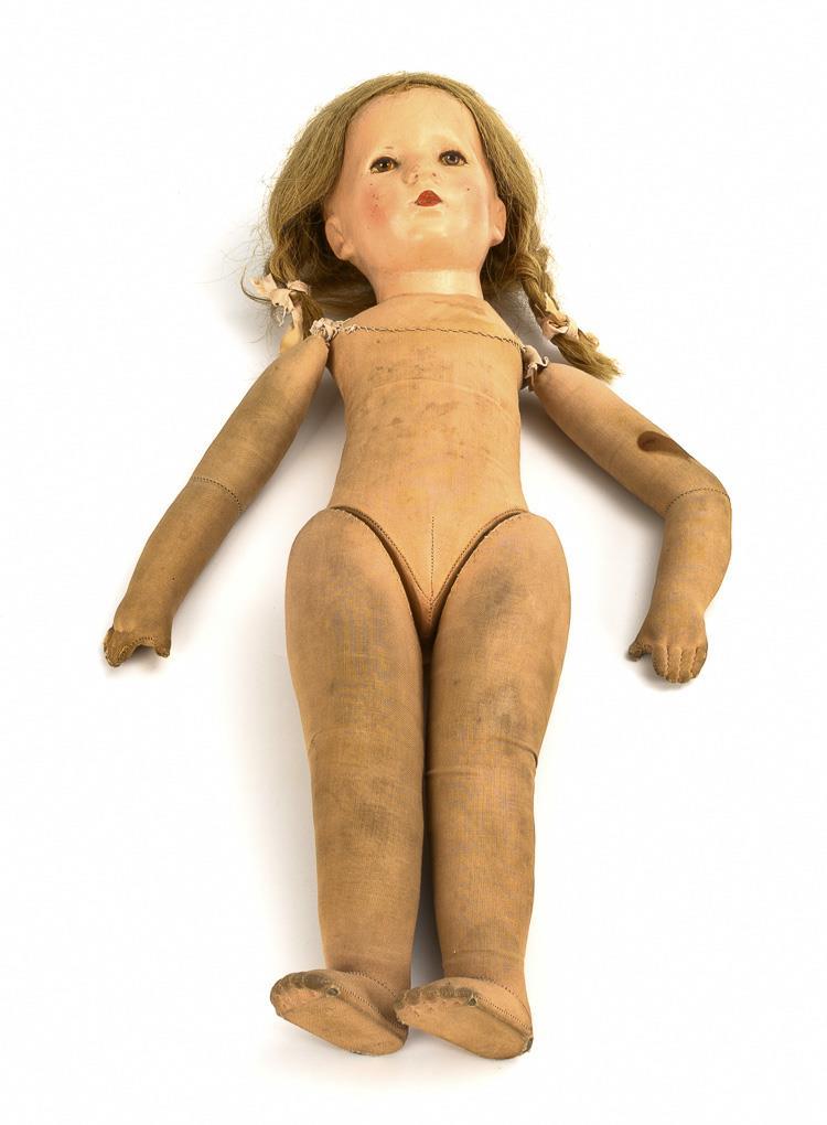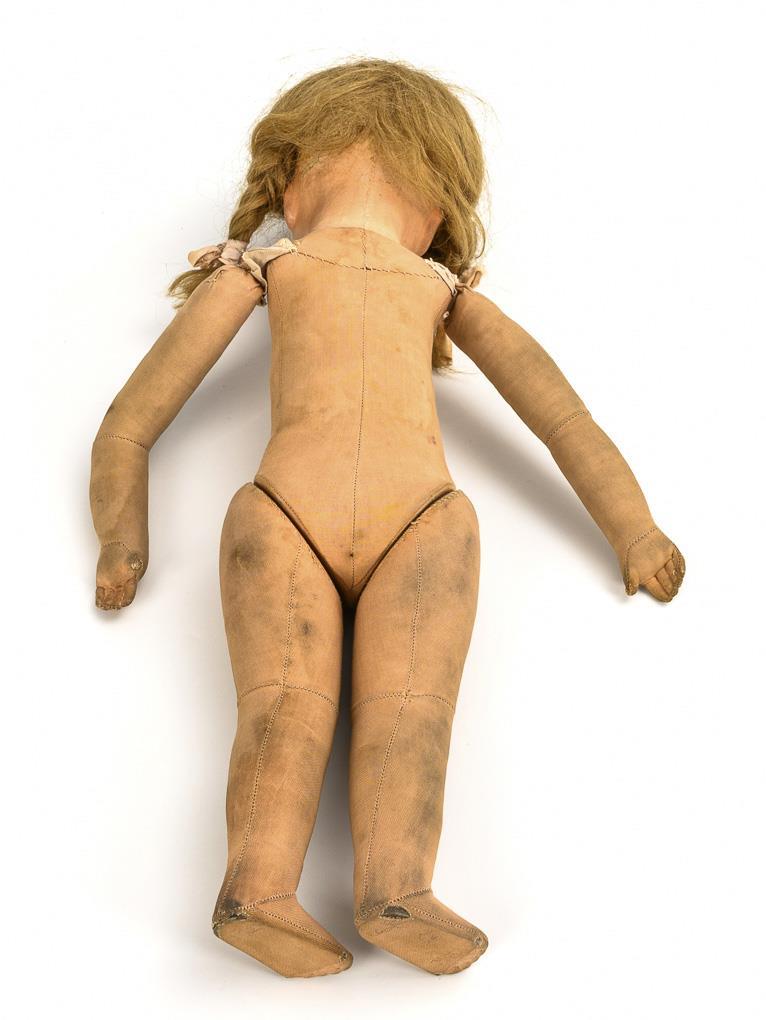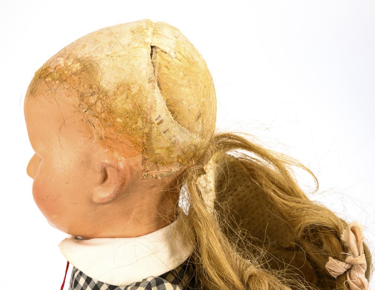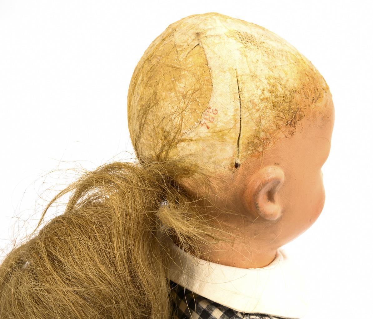 Turnable fabric head with 1 seam at the back of the head, brown eyes and blond real hair wig. Slim fabric body, checkered dress, white fabric shoes. With brown bag and blue school bag. Face with retouching, body stained, small defects on hands and feet.