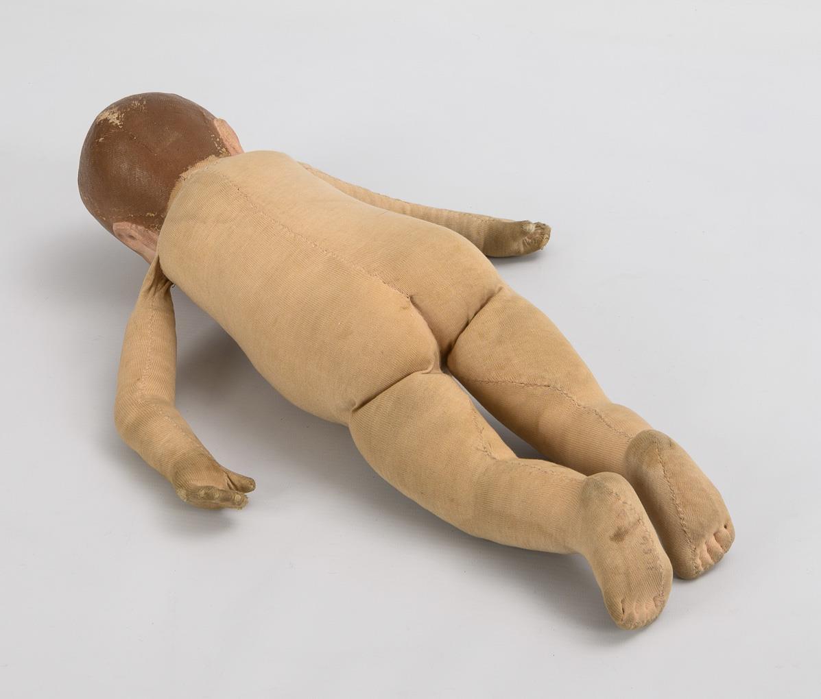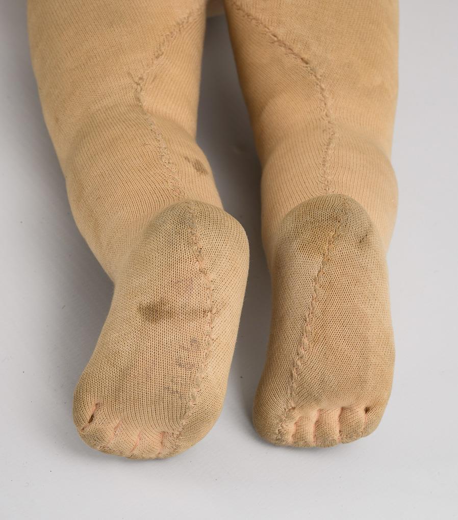 Cloth head with 1 seam at the back of the head, painted blue eyes, painted hair, carefree soft tricot body. White nightgown, houndstooth bib. Worn, hair painting partly rubbed, hands and 1 leg with small defects.
