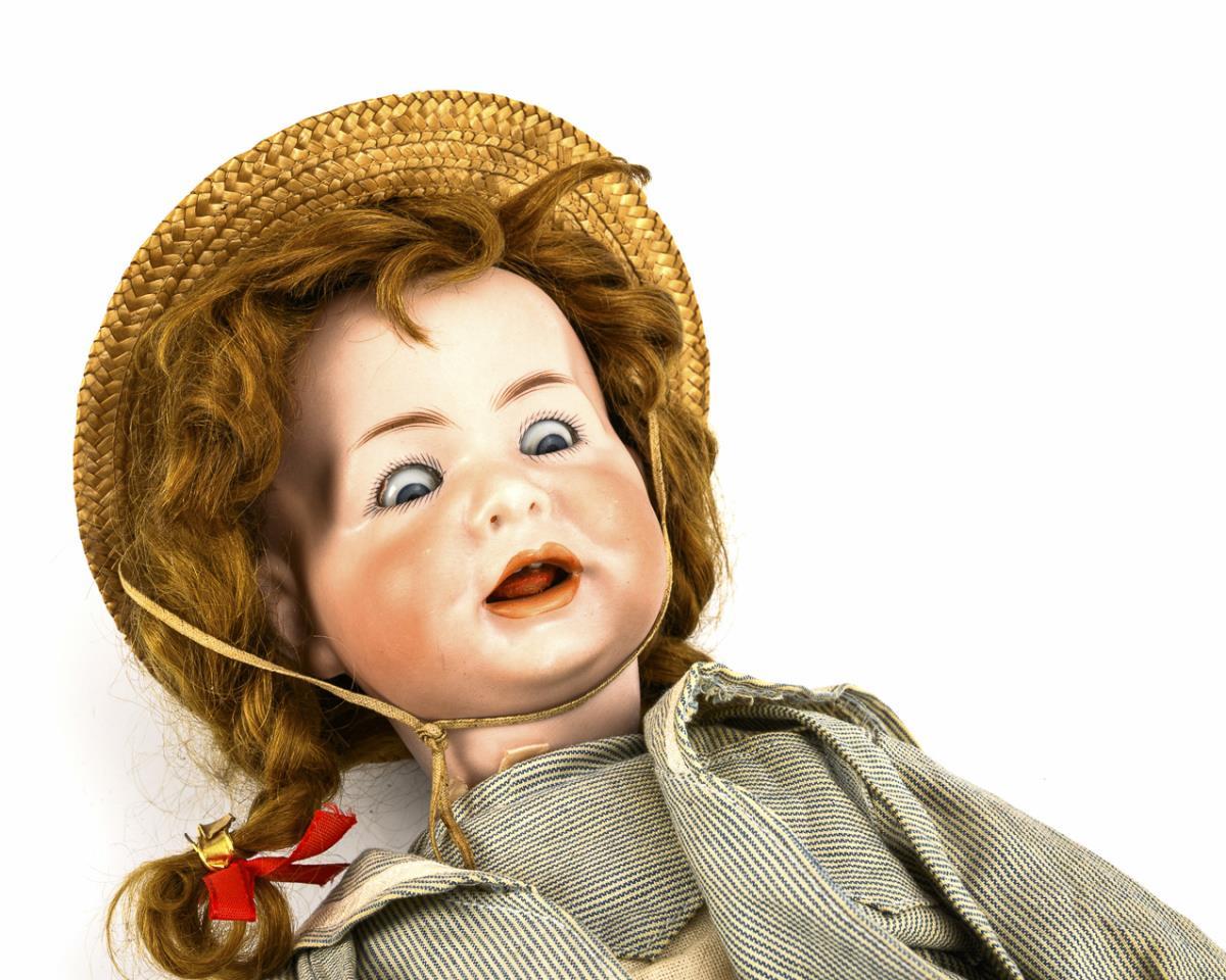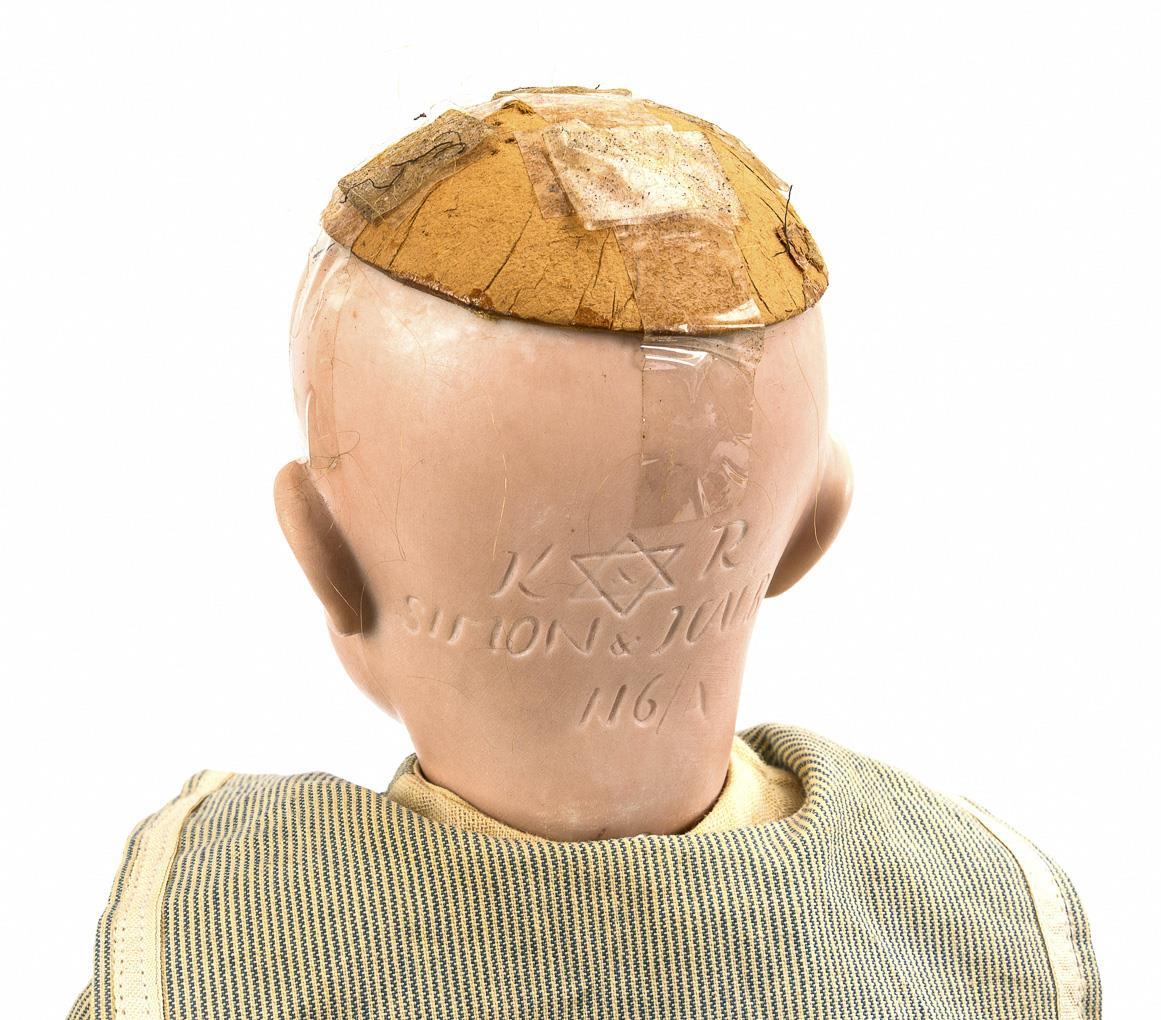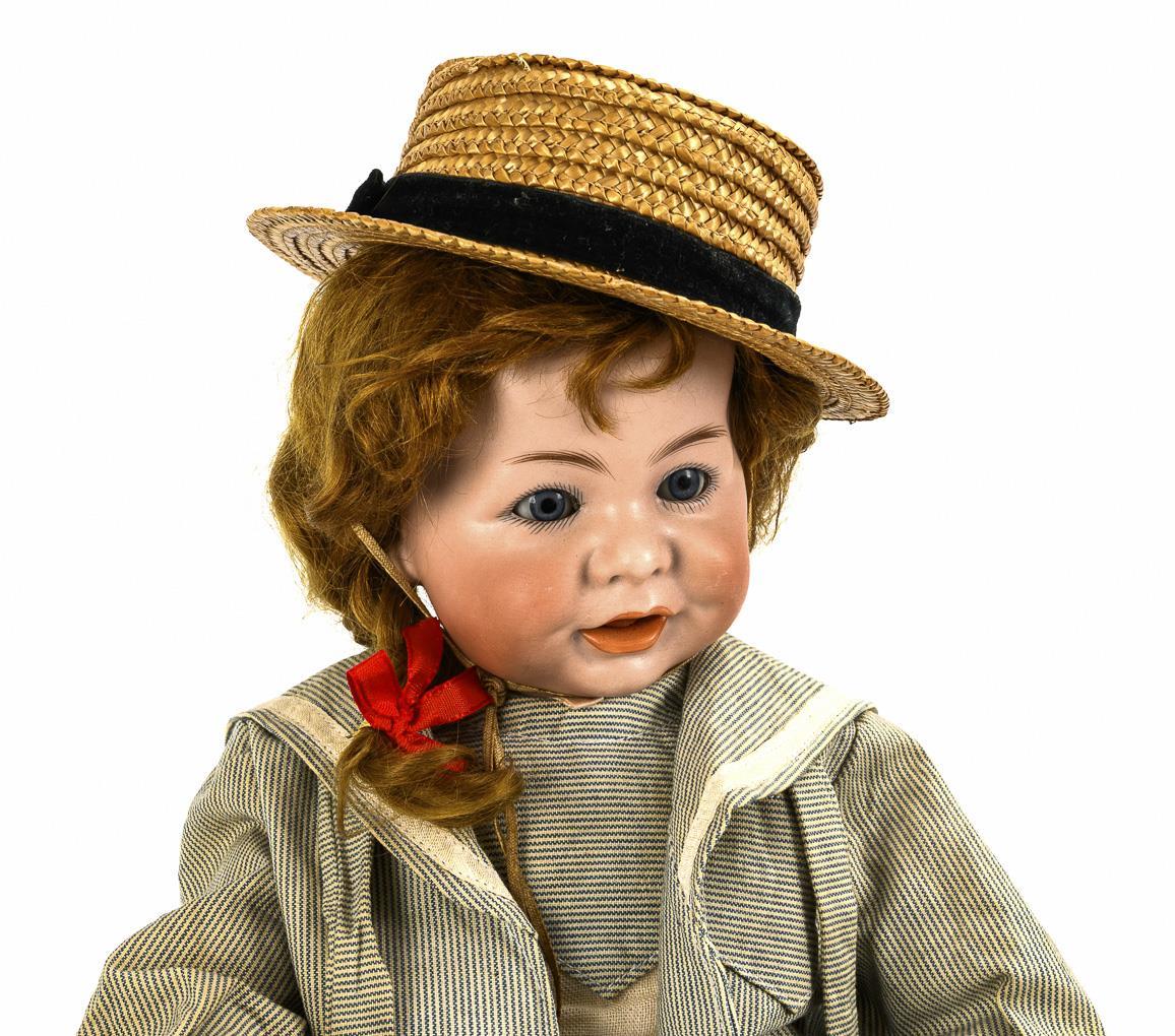 Cranked head, blue sleeping eyes without lids, open smiling mouth with movable tongue, red-brown mohair wig. 17-part toddler body. Blue and white striped dress, black oilcloth shoes, straw hat. Head x-rayed: no defects, only the tip of the tongue retouched and wig added, original body reworked, right hand repaired.