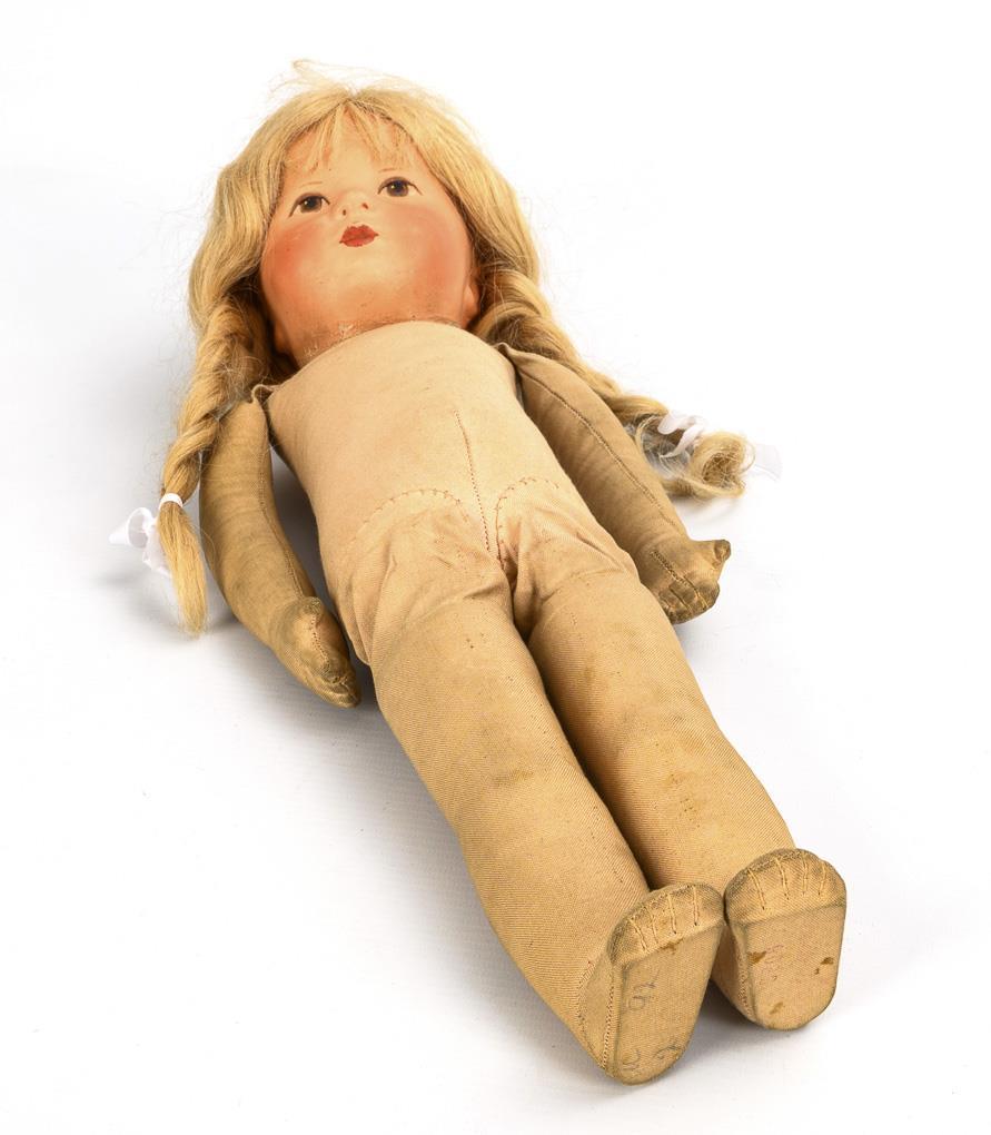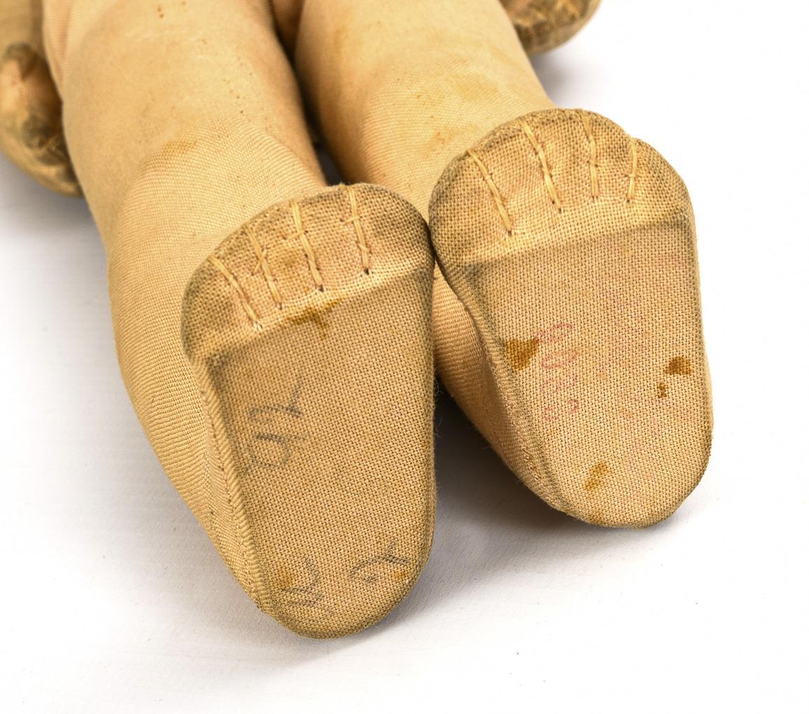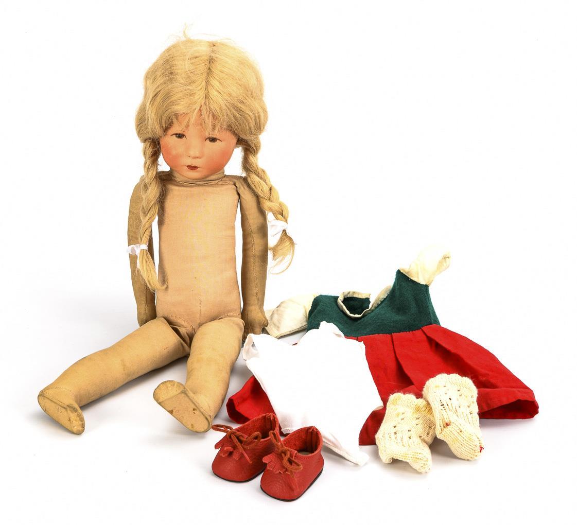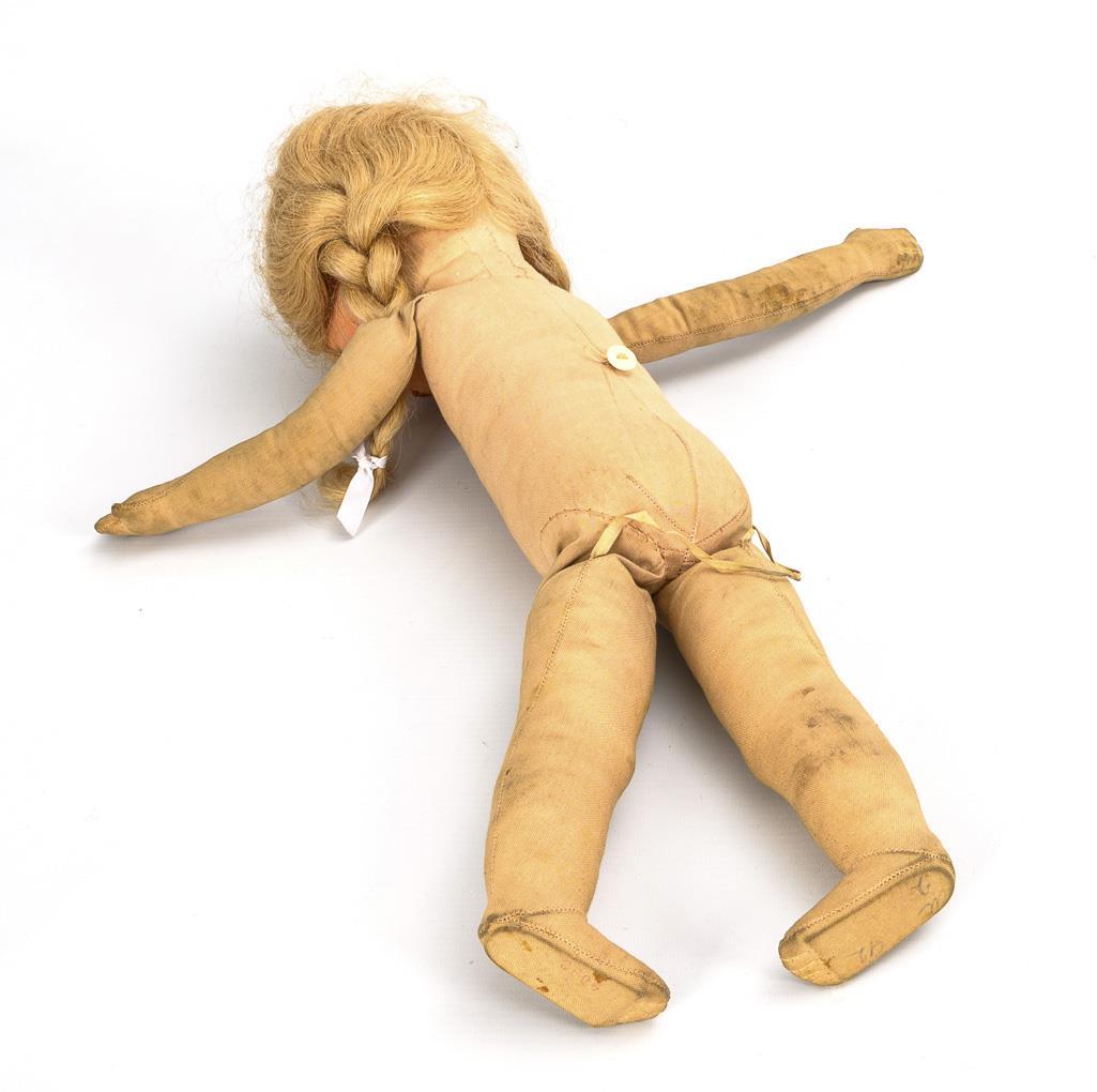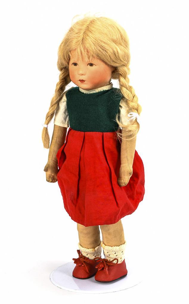 Mask-like painted fabric head with 3 backs of the head, brown eyes, blond real hair. Body with button and little thumbs on the back. Green-red dress, red leather shoes. Face with minimal retouching at the hairline and color abrasion under the chin. Body soiled.
