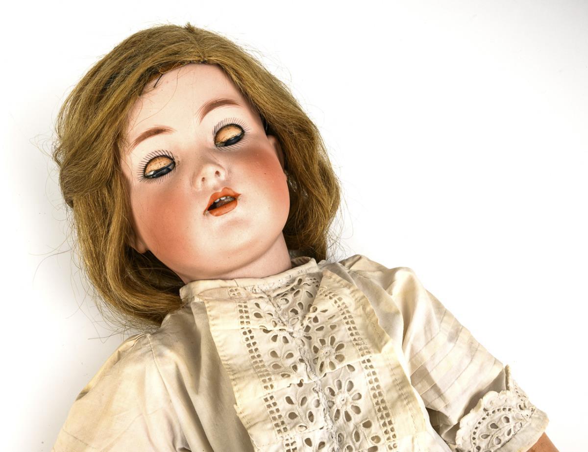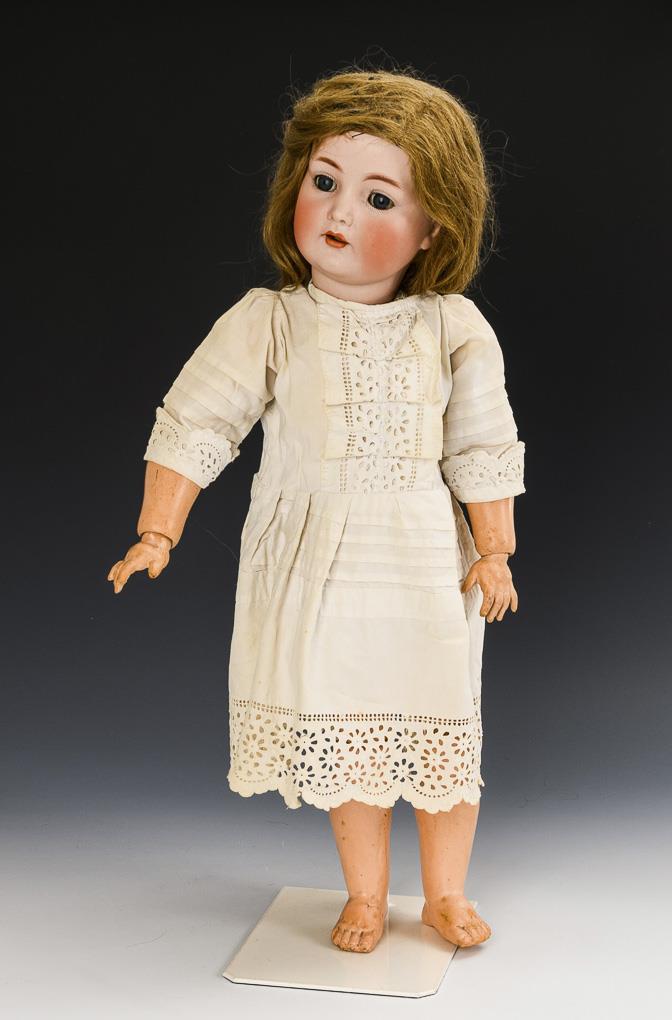 Cranked head, blue sleeping eyes, blonde real hair wig with defects. 17-part jointed body. White dress with perforated embroidery. Head x-rayed: without defects, only base of tongue rubbed. Body worn: several fingers glued, 2 bumped.