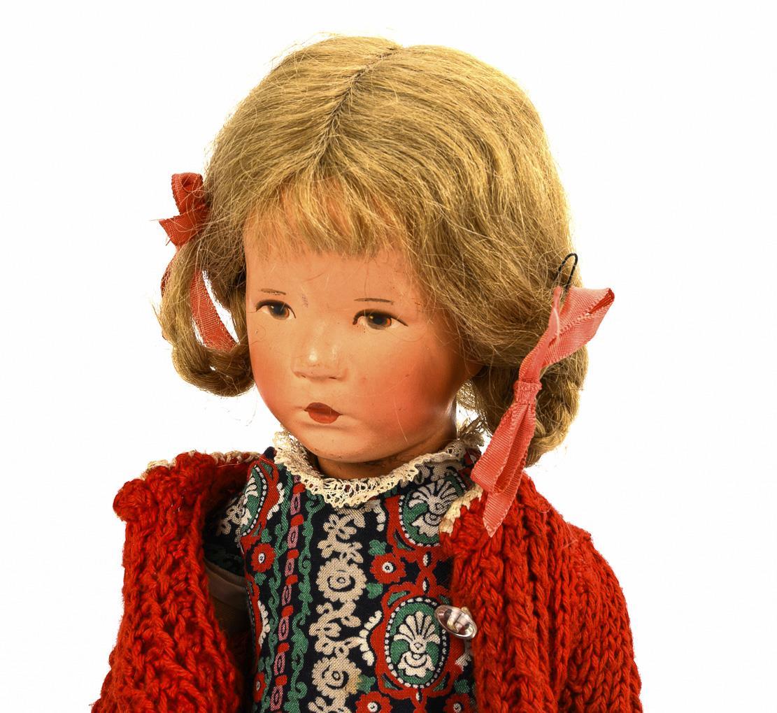 Crank head with 1 seam on the back of the head, painted brown eyes and blond real hair wig. Slender body, old clothes with patterned dress, red cardigan and white shoes. Body minimally soiled.