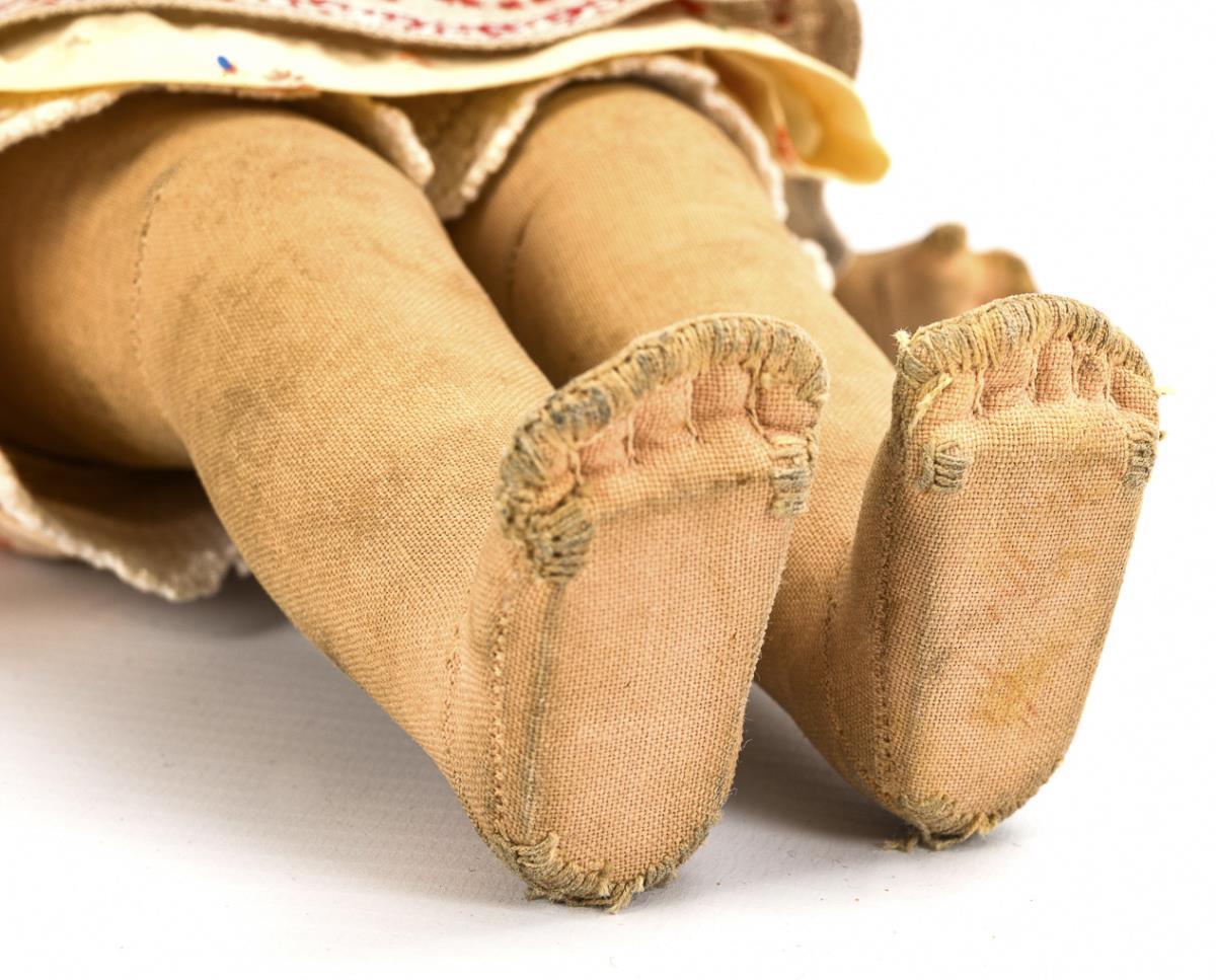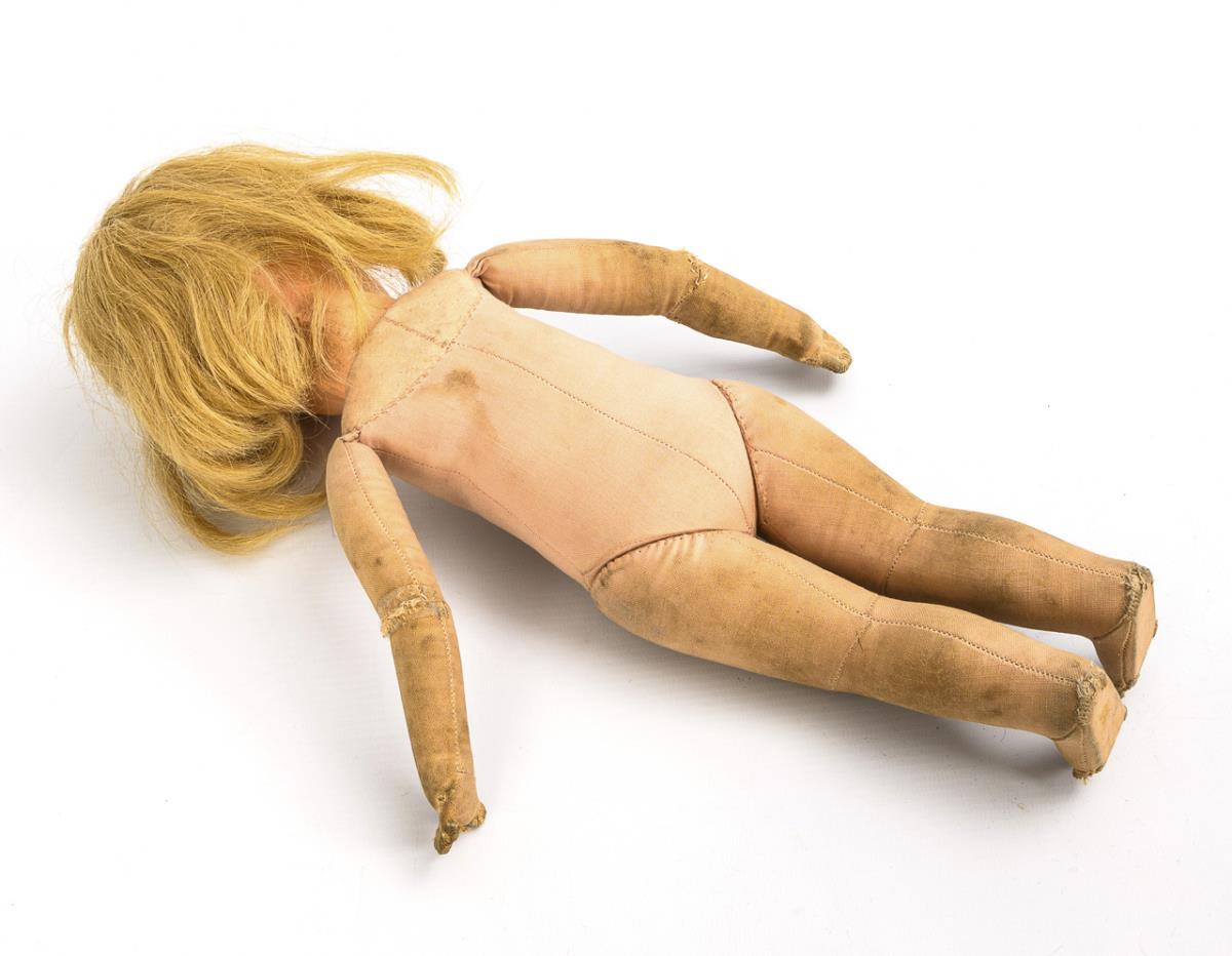 Cranked head with 1 seam on the back of the head, brown eyes, blond real hair wig. Slender body. Flowered dress, embroidered apron, white shoes. Multiple color defects on the face, body soiled, with repairs to elbows, hands and feet.