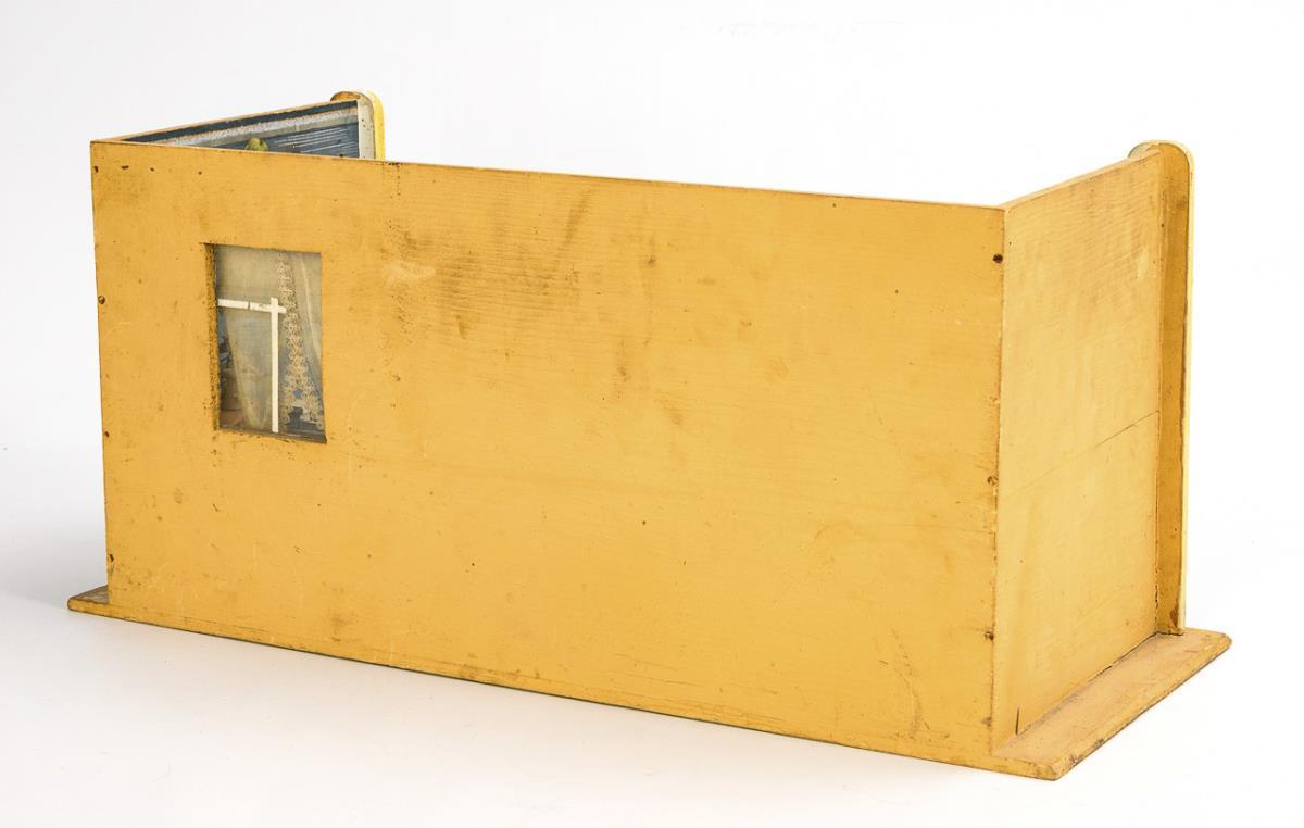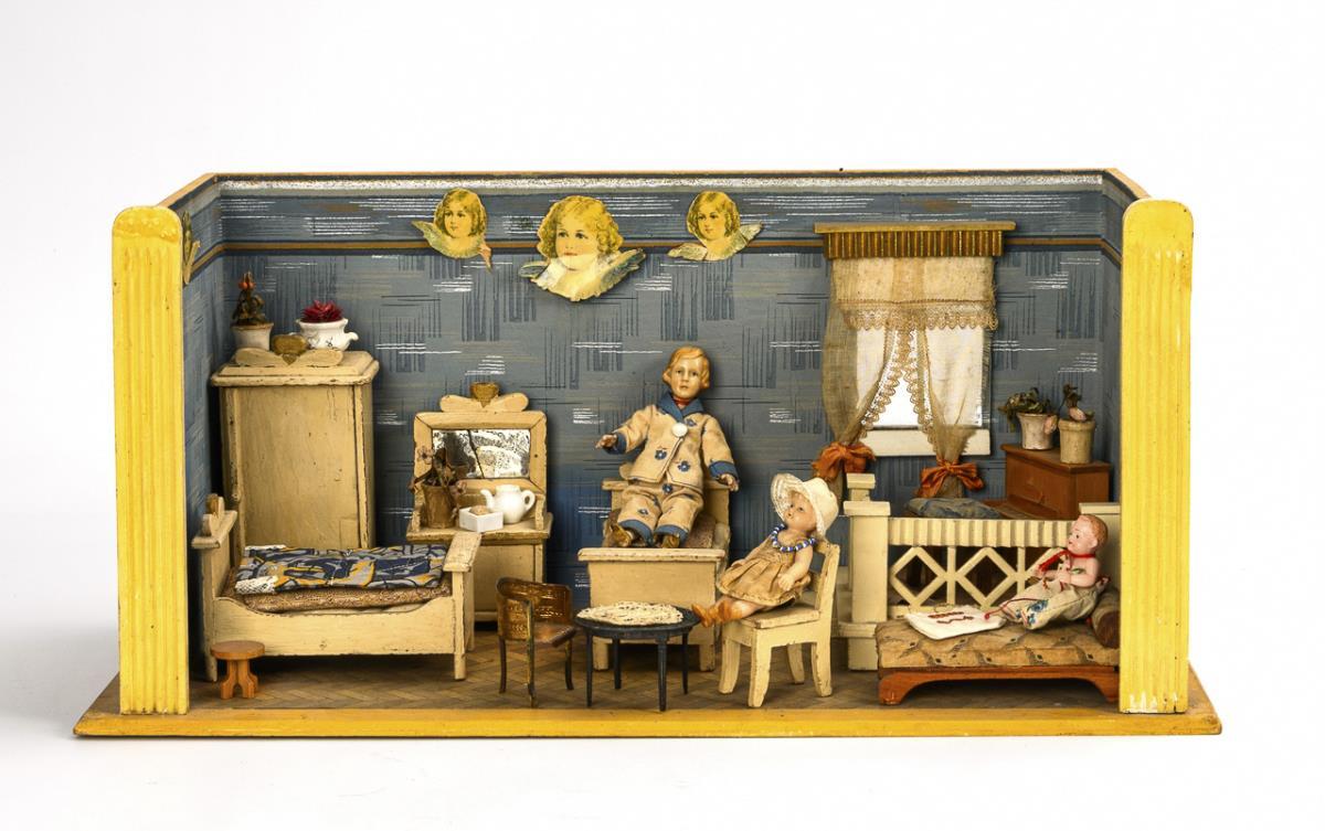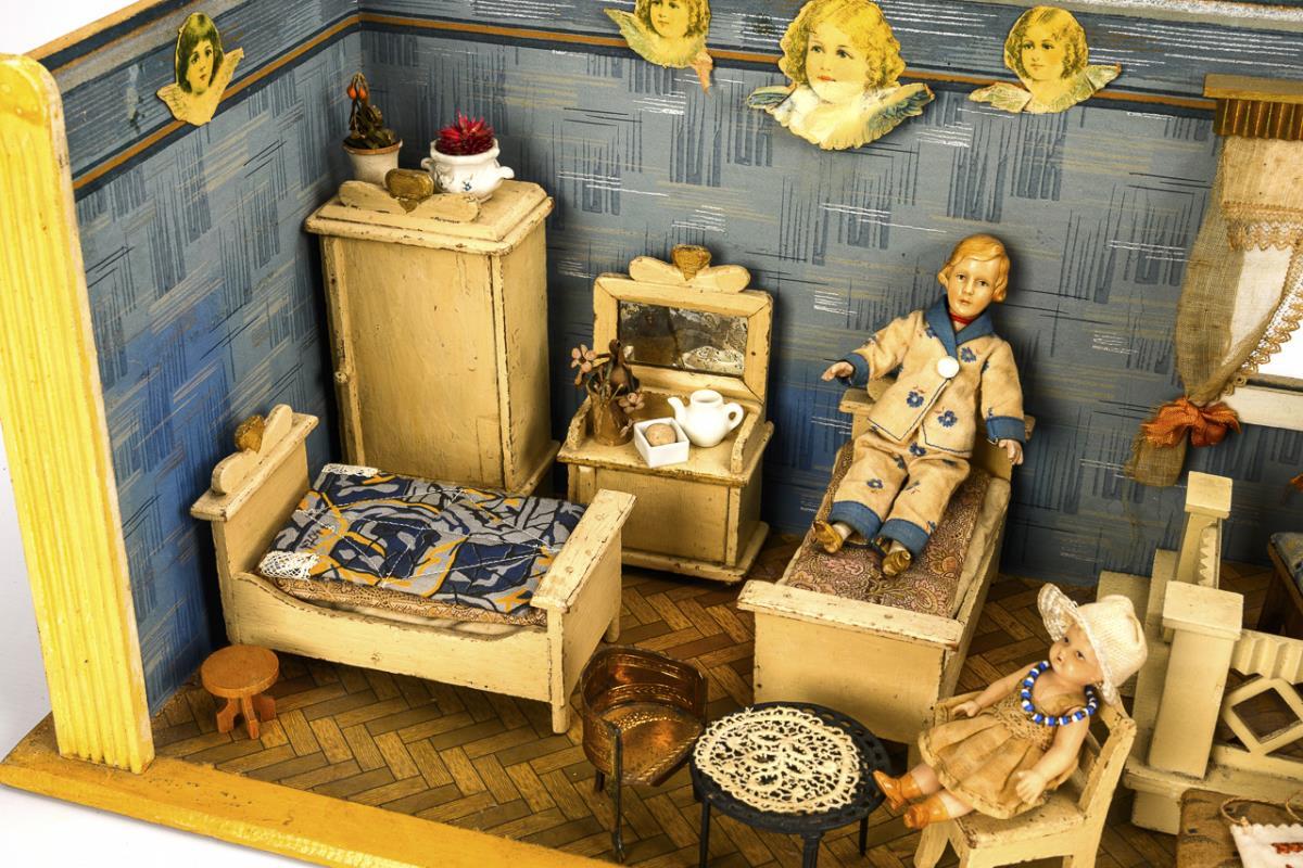 1-room cabinet with glazed window, curtain and small pedestal. Furnished as a bedroom with original white-painted furniture: 2 beds, wardrobe, chest of drawers, chaise longue, small table and 2 chairs. Plus 3 small celluloid dolls. Worn, signs of age, minor defects.