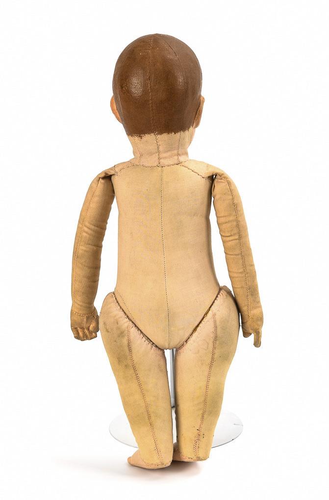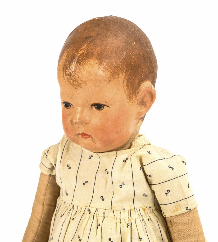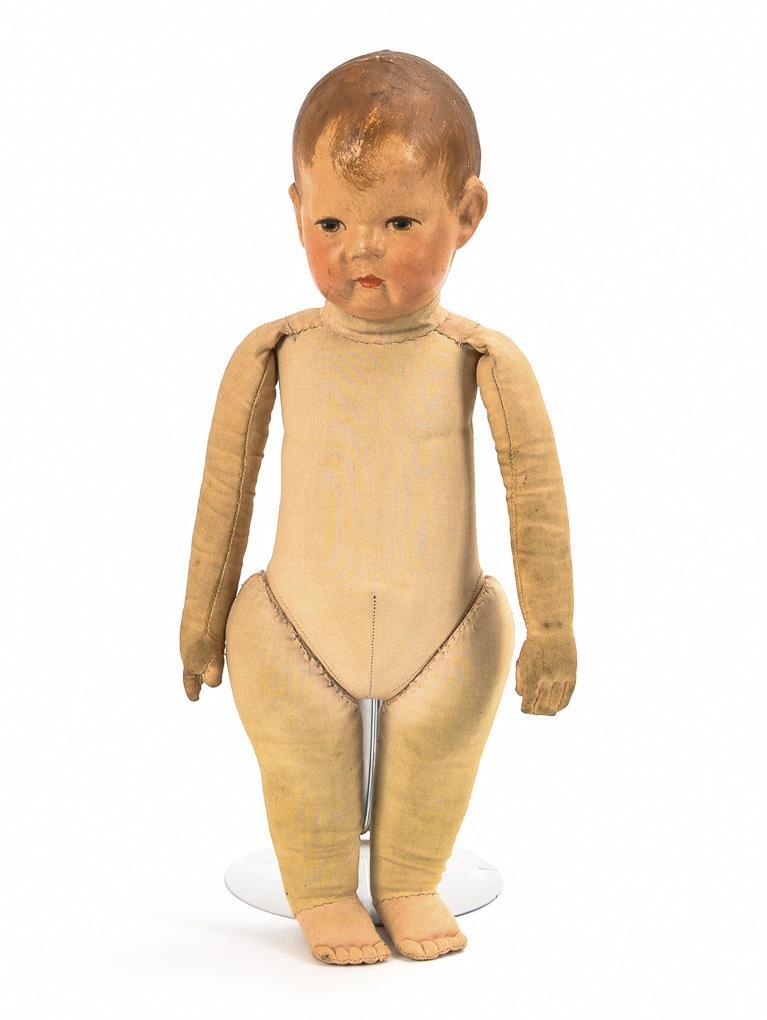 Early version of the "small, cheap Küthe Kruse doll" with mask-like painted head, 3 backs of the head and 2 chins. Cloth body with wide hips. Light-colored dress, black shoes. With new, red cardboard box with inscription "Käthe-Kruse Familie". Face rubbed, ears and skull seam with color defects.