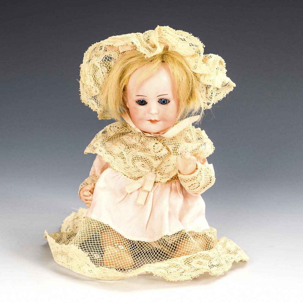 Cranked head, blue sleeping eyes, closed mouth, blonde mohair wig. 5-part sitting baby body, pink lace dress with matching bonnet. Head x-rayed: without defects, body partially painted over.