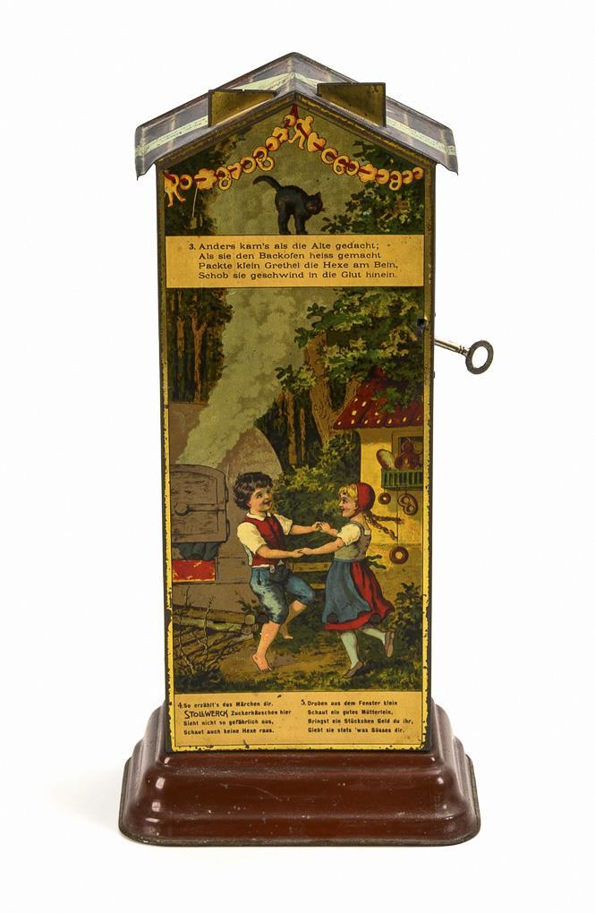 Mechanical chocolate vending machine with motifs from "Hänsel und Gretel". 1 key (unsuitable?) enclosed. Slight signs of age, front window with small defect.