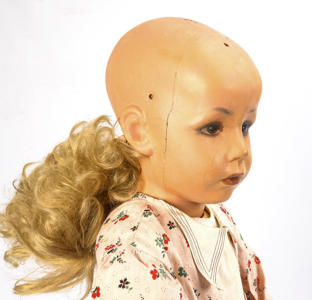 Size 10. Removable magnesite crank head, brown eyes, knotted blond human hair beads. Standing leotard body with firm legs and holes in the soles. Pink dress with flower pattern, white children's sandals. Head cracked, fabric on fingers and right foot with defects.