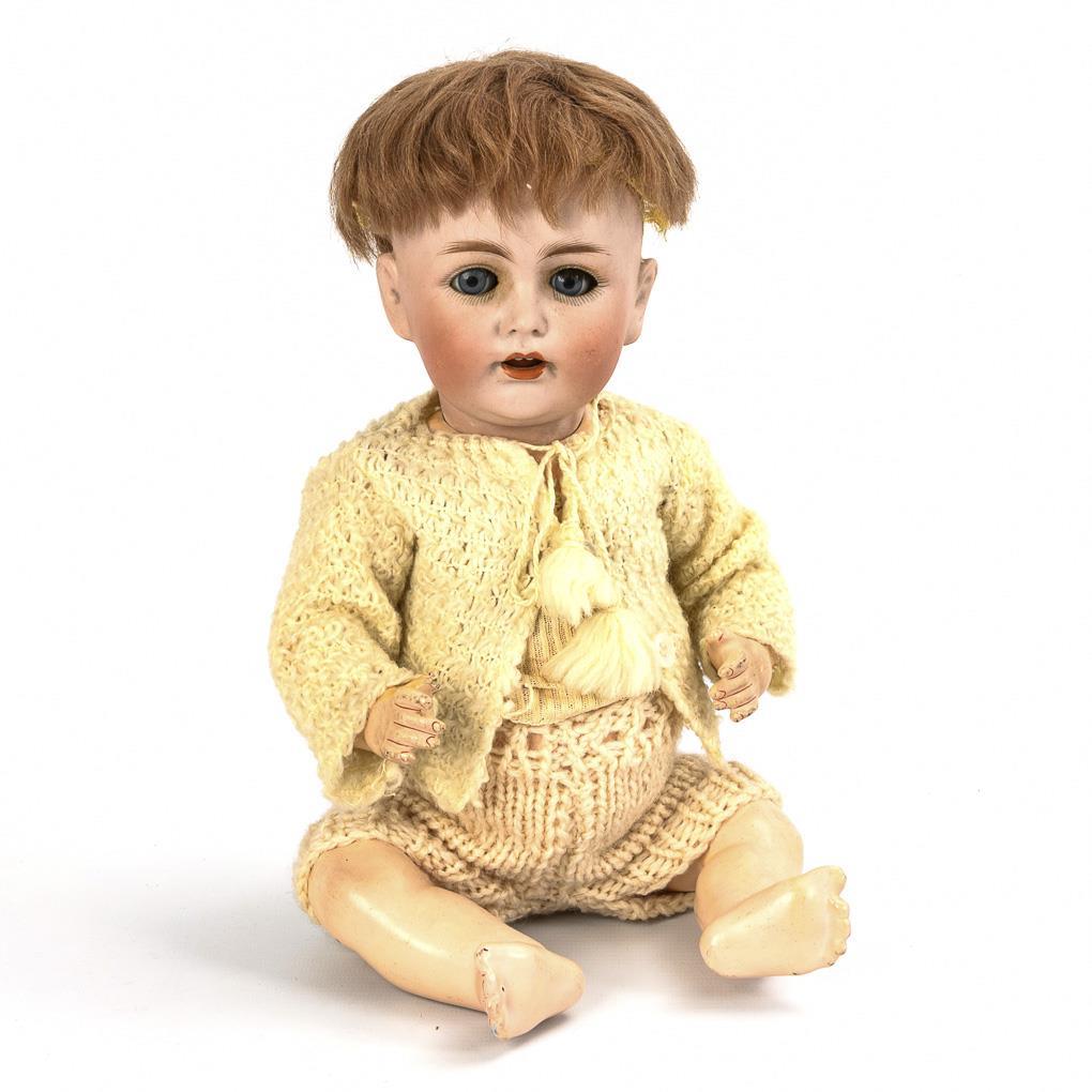 Cranked head, blue eyes, remnants of eyelashes, blonde mohair wig. 5-part sitting baby body with intact voice. Light-colored knitted clothing. Head x-rayed: without cracks, only 2 small chips on the fold of the crown of the head. Right thumb missing.