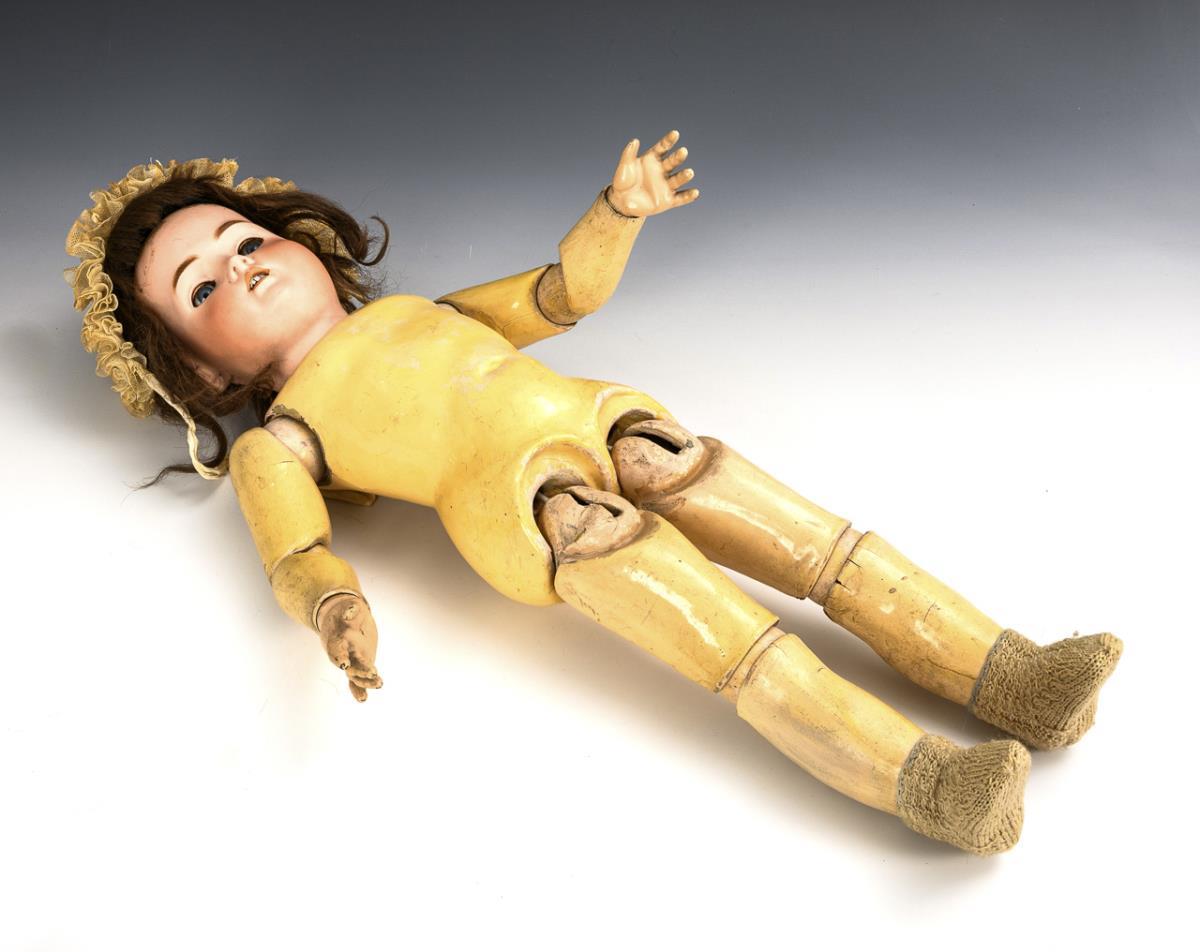 Cranked head, blue sleeping eyes, eyelashes, pierced ears, brown real hair wig. 17-part jointed body. White dress, lace bonnet. Head x-rayed: without cracks, only minimal wig pull and 1 chip at the right ear hole. Body with color defects and overpainting, hands deviating in color.