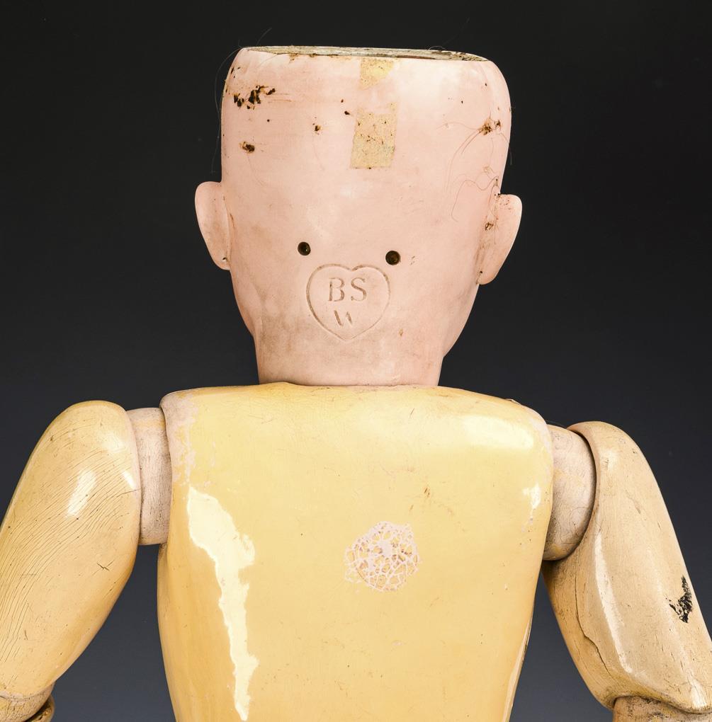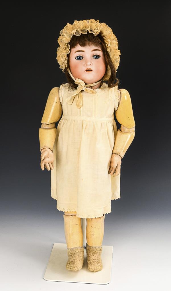 Cranked head, blue sleeping eyes, eyelashes, pierced ears, brown real hair wig. 17-part jointed body. White dress, lace bonnet. Head x-rayed: without cracks, only minimal wig pull and 1 chip at the right ear hole. Body with color defects and overpainting, hands deviating in color.
