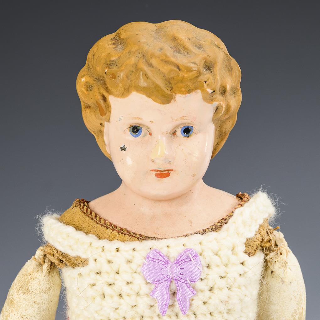 Each with chest head, modeled hair, blue eyes and leather or wax cloth body. Large Minerva girl with fixed glass eyes, mass arms and white dress (L 49 cm), small doll with covered mark, painted eyes, bisque forearms and crocheted clothing (L 29 cm). Heads with paint retouches, 1x lacquer with traces of ageing. Body with small defects.