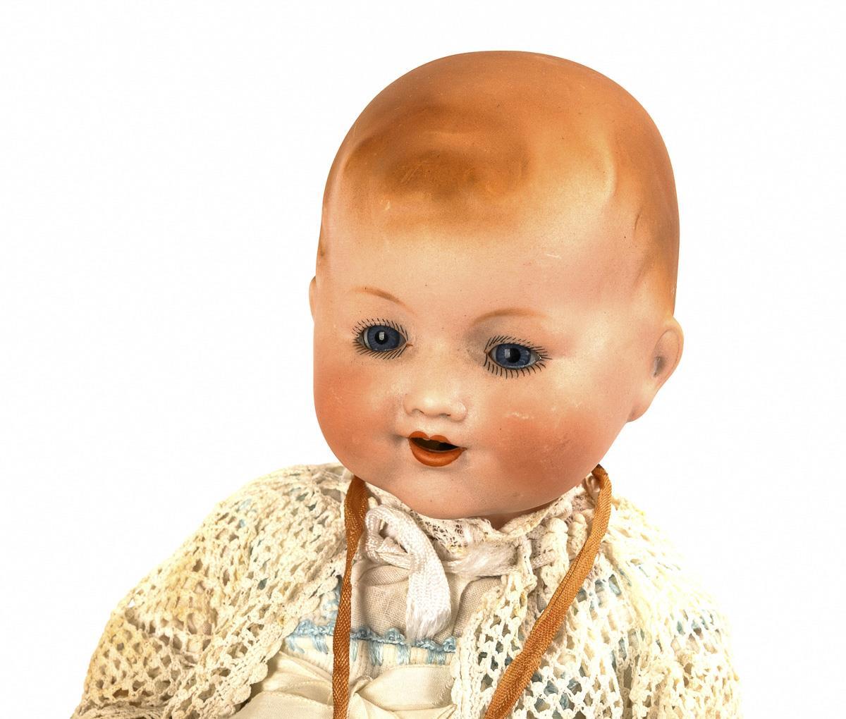 Biscuit porcelain, fabric, celluloid. L 32 cm.