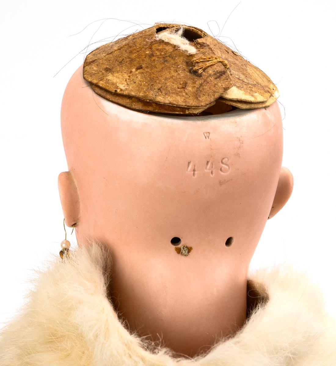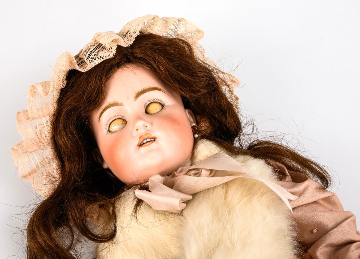 Cranked head, blue sleeping eyes, 1 earring, dark brown real hair wig. 15-part articulated body, stamped red in Cyrillic script under the feet. Dress of wild silk with pearl trimming, matching hood, white shawl, small handbag and white oilcloth shoes. Head x-rayed: without defects, only small chips at the ear holes. Body with color defects, hands and feet with repairs/repainting.